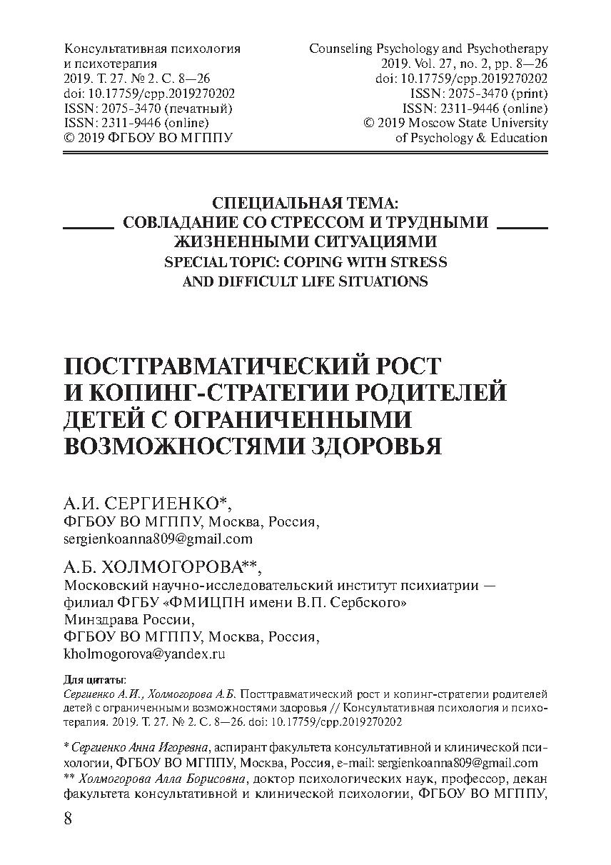 Подчеркивается необходимость психологической помощи родителям, которая является предиктором максимально успешного развития ребенка и повышения качества жизнедеятельности самого родителя. В ходе исследования 113 родителей детей с ОВЗ заполнили «Опросник посттравматического роста» и «Опросник способов совладания» (WCQ). Результаты показали, что разные стратегии совладания со стрессом могут препятствовать или способствовать ПТР родителей. Значимое положительное влияние на ПТР оказывают копинг-стратегии «Положительная переоценка», «Принятие ответственности», «Конфронтативный копинг», «Поиск социальной поддержки». Негативное влияние на ПТР оказывает копинг-стратегия «Планирование».