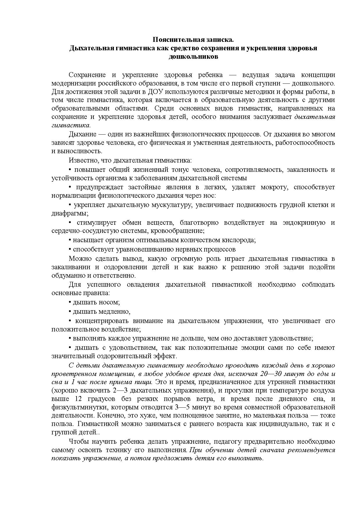 Сохранение и укрепление здоровья ребенка — ведущая задача концепции модернизации российского образования, в том числе его первой ступени — дошкольного. Для достижения этой задачи в ДОУ используются различные методики и формы работы, в том числе гимнастика, которая включается в образовательную деятельность с другими образовательными областями. Среди основных видов гимнастик, направленных на сохранение и укрепление здоровья детей, особого внимания заслуживает дыхательная гимнастика.