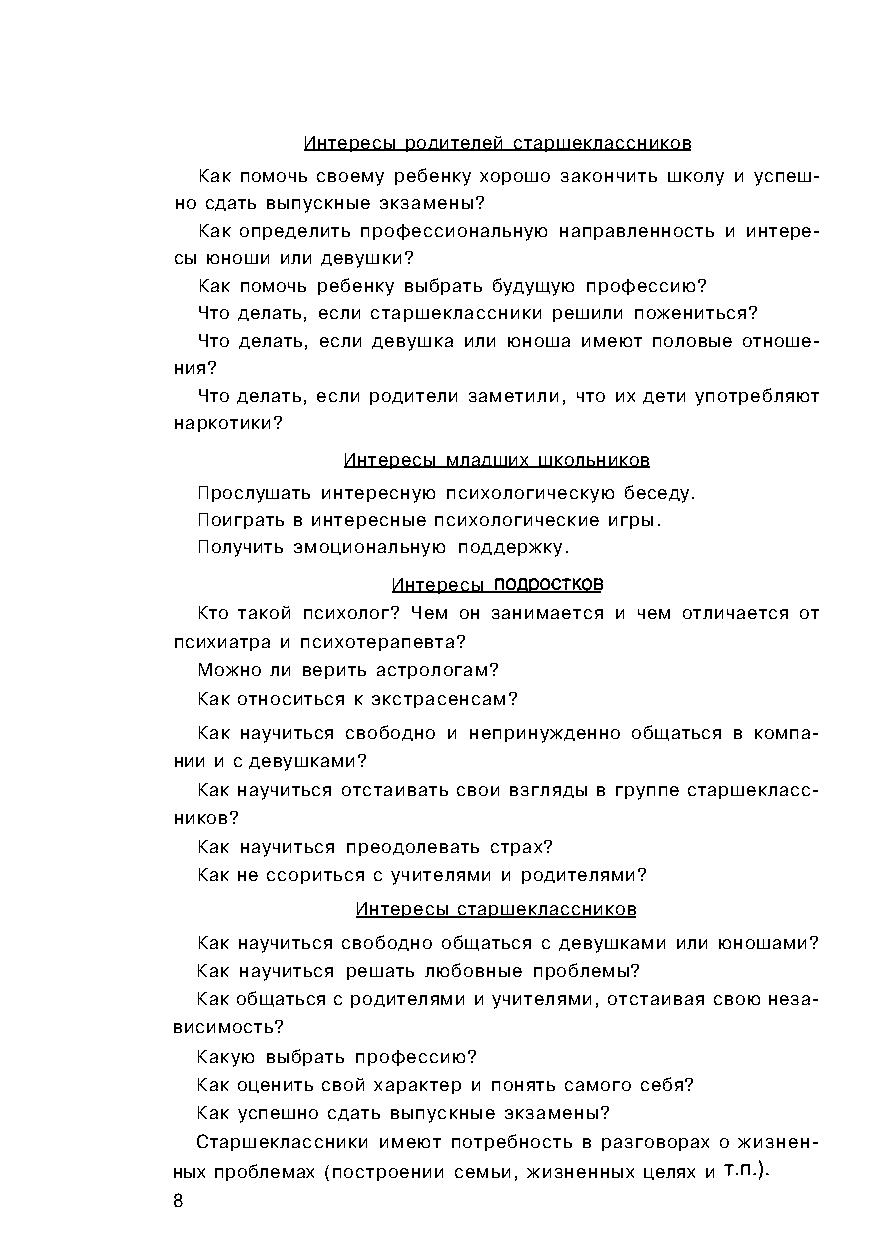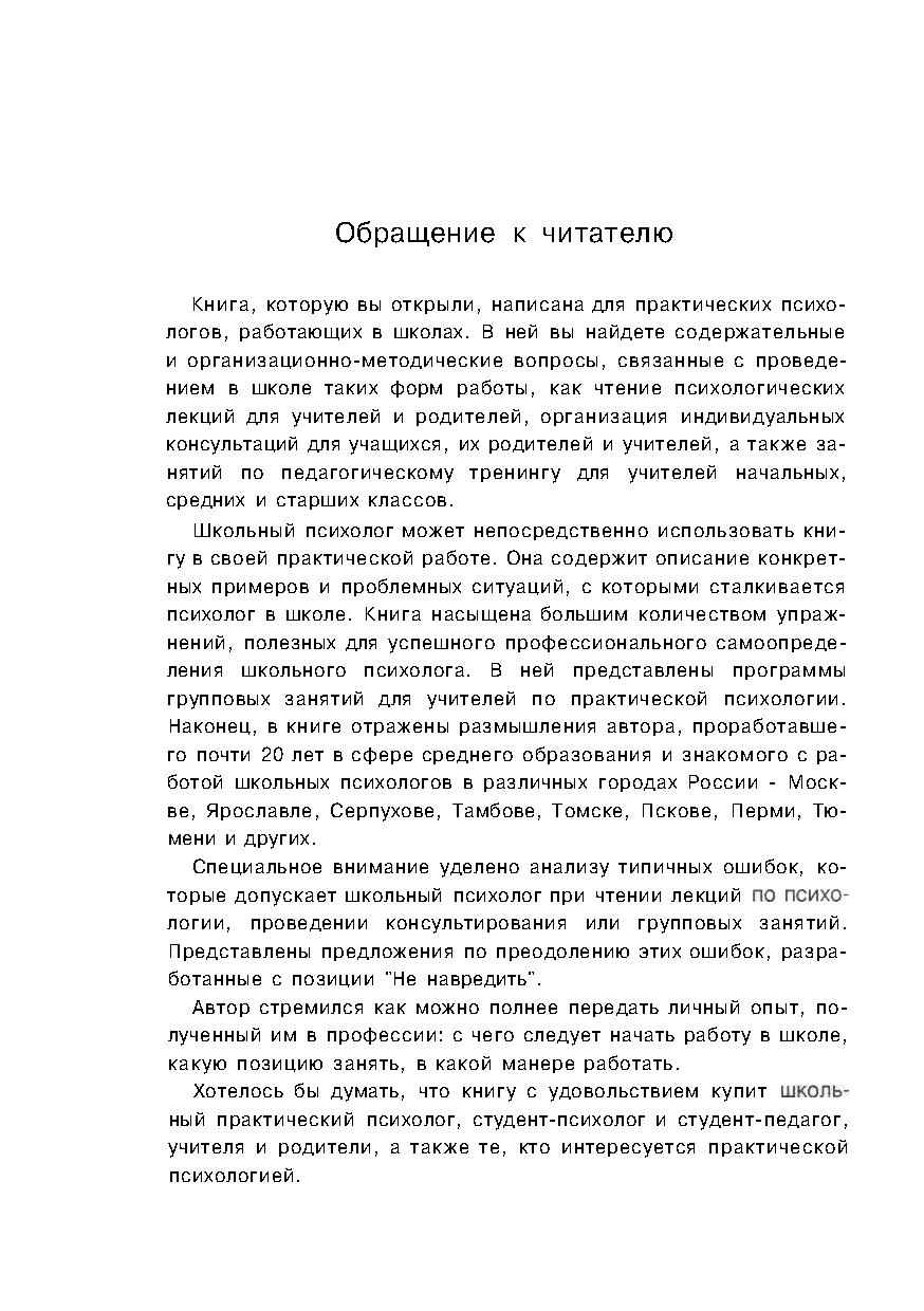 Книга насыщена большим количеством примеров, проблемных ситуаций и упражнений, полезных для успешного профессионального самоопределения школьного психолога.