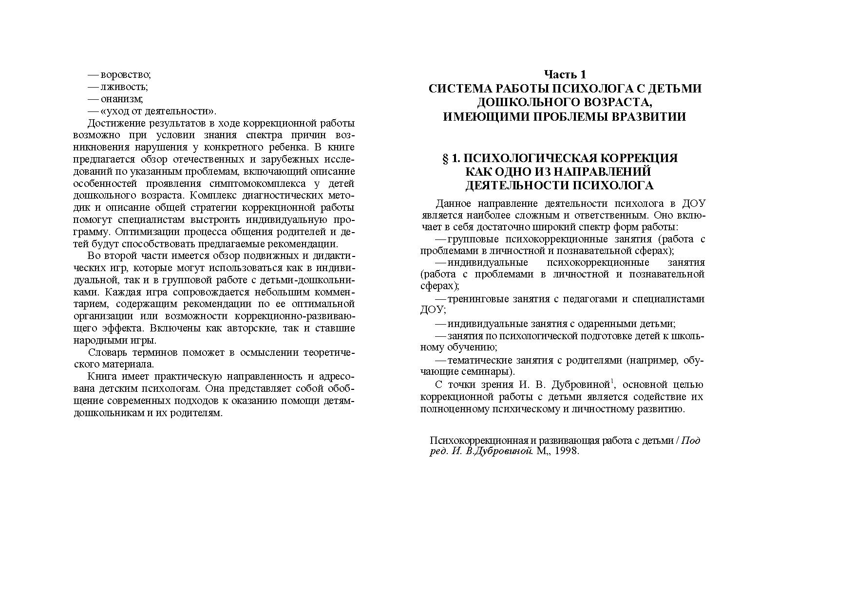 В книге дается обзор современных отечественных и зарубежных исследований по проблемам развития детей дошкольников (гиперактивность, агрессивность, застенчивость, ранний детский аутизм, задержка психического развития и т.д.). Комплекс диагностических методик и описание общей стратегии коррекционной работы помогут специалистам выстроить индивидуальную программу. Предлагаемые рекомендации будут способствовать оптимизации общения родителей и детей.