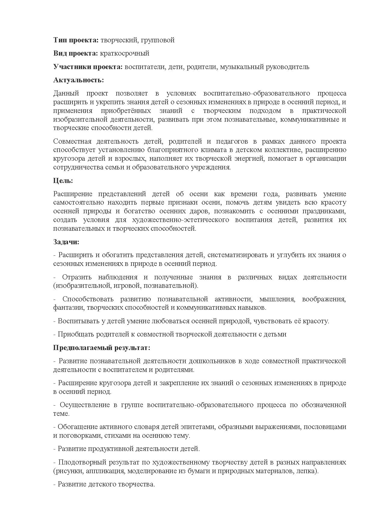 Данный проект позволяет в условиях воспитательно-образовательного процесса расширить и укрепить знания детей о сезонных изменениях в природе в осенний период, и применения приобретённых знаний с творческим подходом в практической изобразительной деятельности, развивать при этом познавательные, коммуникативные и творческие способности детей.