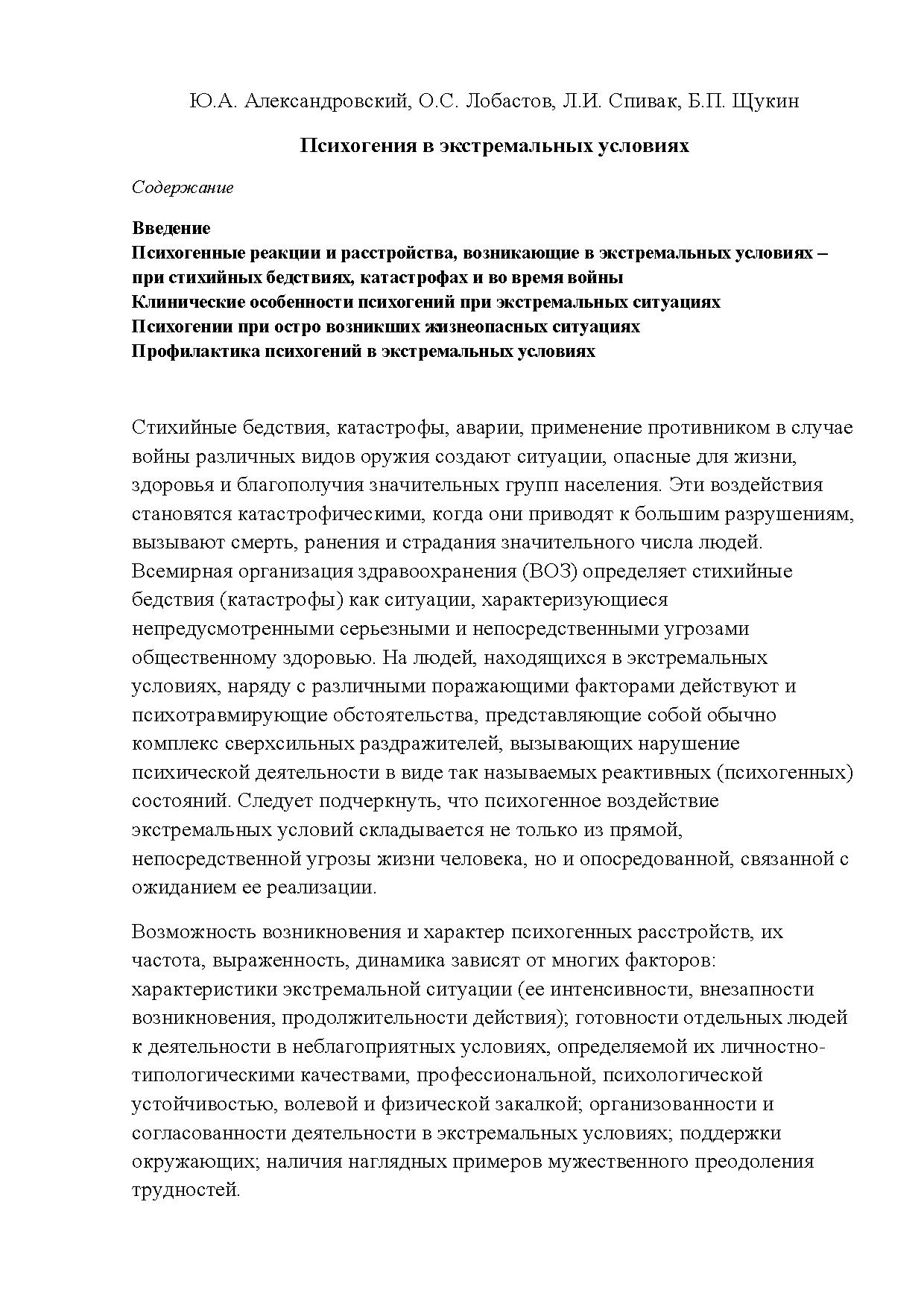 В монографии систематизируются клинические проявления психогенно обусловленных психических нарушений, наблюдаемых при стихийных бедствиях и катастрофах, а также рассматриваются их величина и структура.
