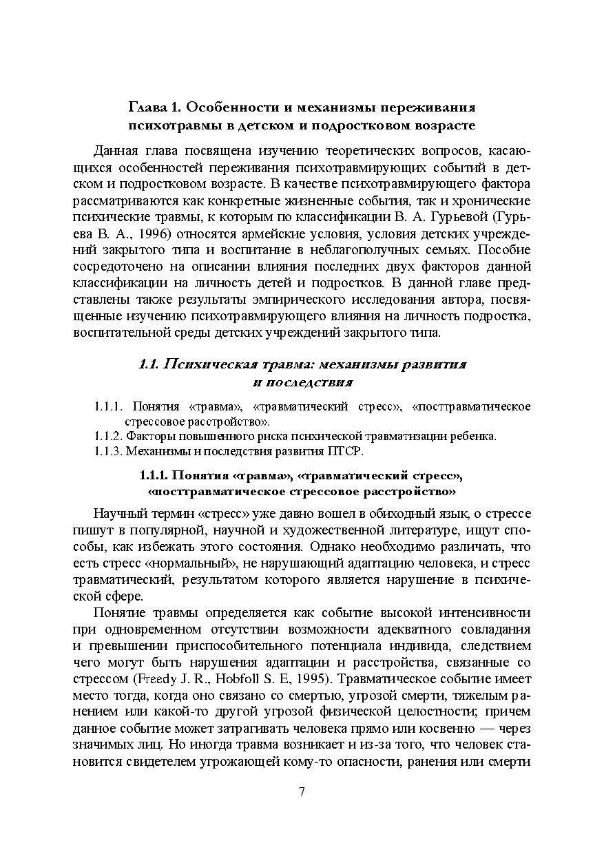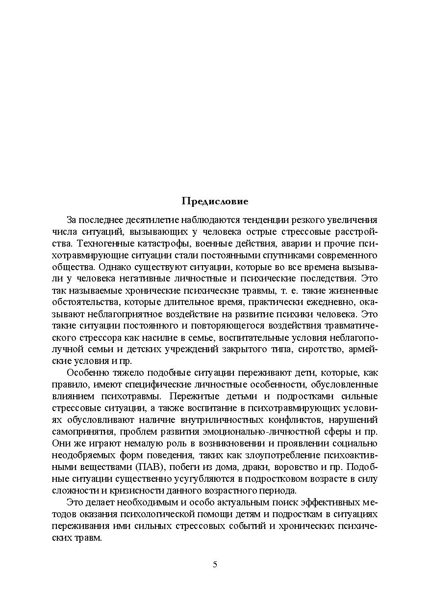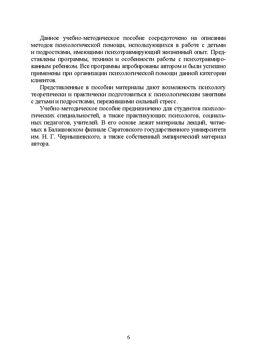 Учебно-методическое пособие посвящено описанию методических основ оказания психологической помощи детям и подросткам, имеющим психотравмирующий опыт. В издании рассматриваются особенности и механизмы переживания психотравмы в детском и подростковом возрасте. Изучено влияние анализу хронических психических травм (воспитание в неблагополучных семьях, вне семьи, в детских учреждениях закрытого типа и пр.) на развитие личности. Пособие содержит результаты эмпирического исследования автора, посвященные исследованию специфических личностных особенностей подростков, воспитывающихся в психотравмирующих воспитательных условиях школы-интерната.