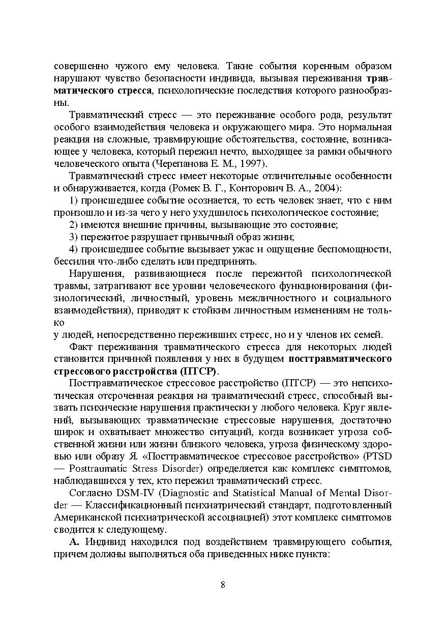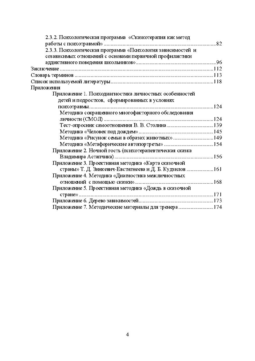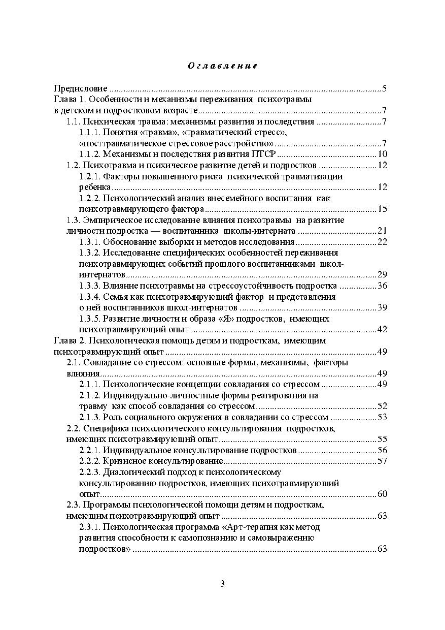 Учебно-методическое пособие посвящено описанию методических основ оказания психологической помощи детям и подросткам, имеющим психотравмирующий опыт. В издании рассматриваются особенности и механизмы переживания психотравмы в детском и подростковом возрасте. Изучено влияние анализу хронических психических травм (воспитание в неблагополучных семьях, вне семьи, в детских учреждениях закрытого типа и пр.) на развитие личности. Пособие содержит результаты эмпирического исследования автора, посвященные исследованию специфических личностных особенностей подростков, воспитывающихся в психотравмирующих воспитательных условиях школы-интерната.