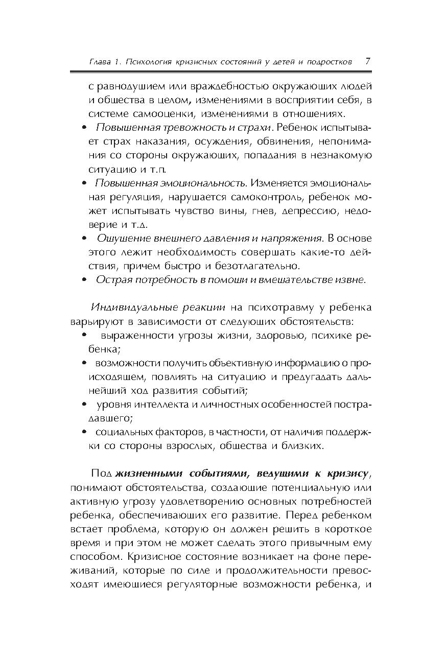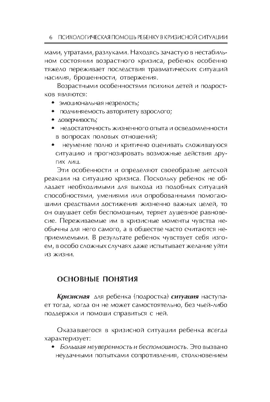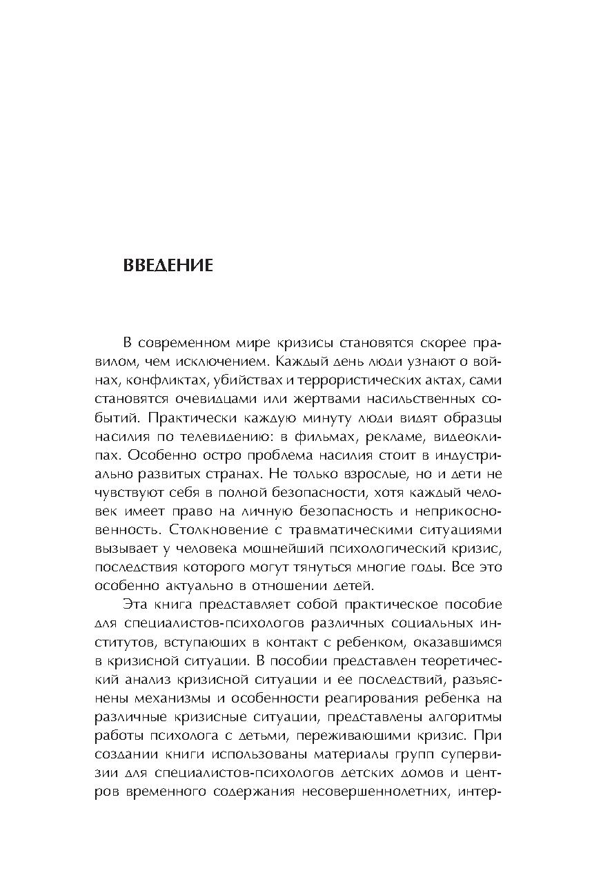 В пособии представлен теоретический анализ кризисной ситуации и ее последствий, проанализированы механизмы и особенности реагирования ребенка на различные кризисные ситуации, представлены алгоритмы работы психолога с детьми, переживающими кризис. При создании книги использованы материалы групп супервизии для специалистов–психологов детских домов и центров временного содержания несовершеннолетних, интернатных учреждений г. Москвы и Подмосковья.