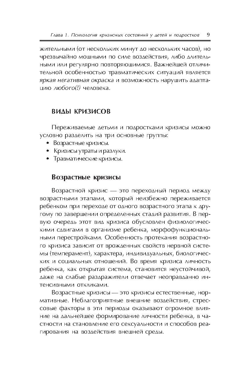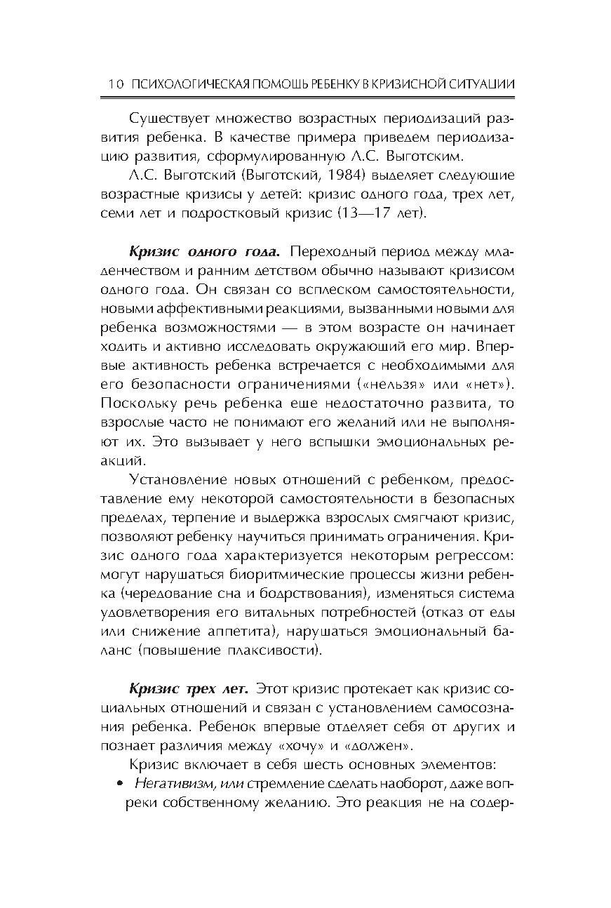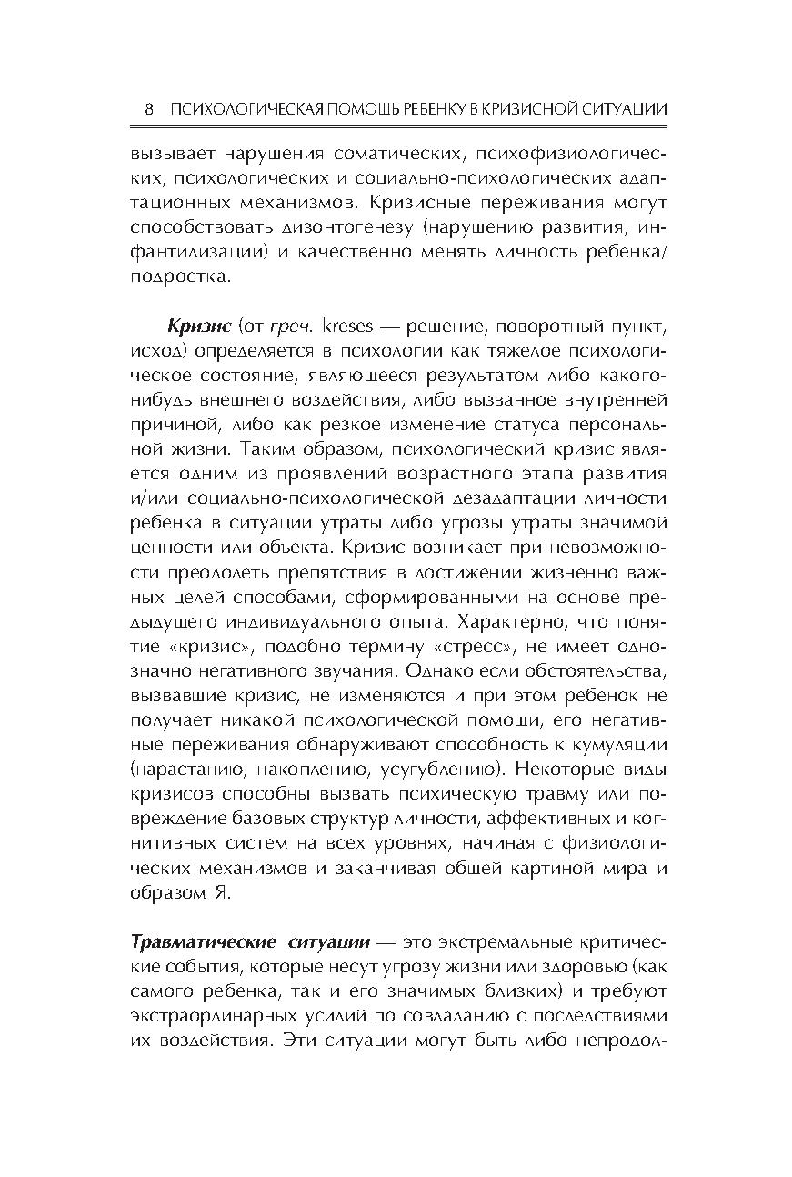 В пособии представлен теоретический анализ кризисной ситуации и ее последствий, проанализированы механизмы и особенности реагирования ребенка на различные кризисные ситуации, представлены алгоритмы работы психолога с детьми, переживающими кризис. При создании книги использованы материалы групп супервизии для специалистов–психологов детских домов и центров временного содержания несовершеннолетних, интернатных учреждений г. Москвы и Подмосковья.