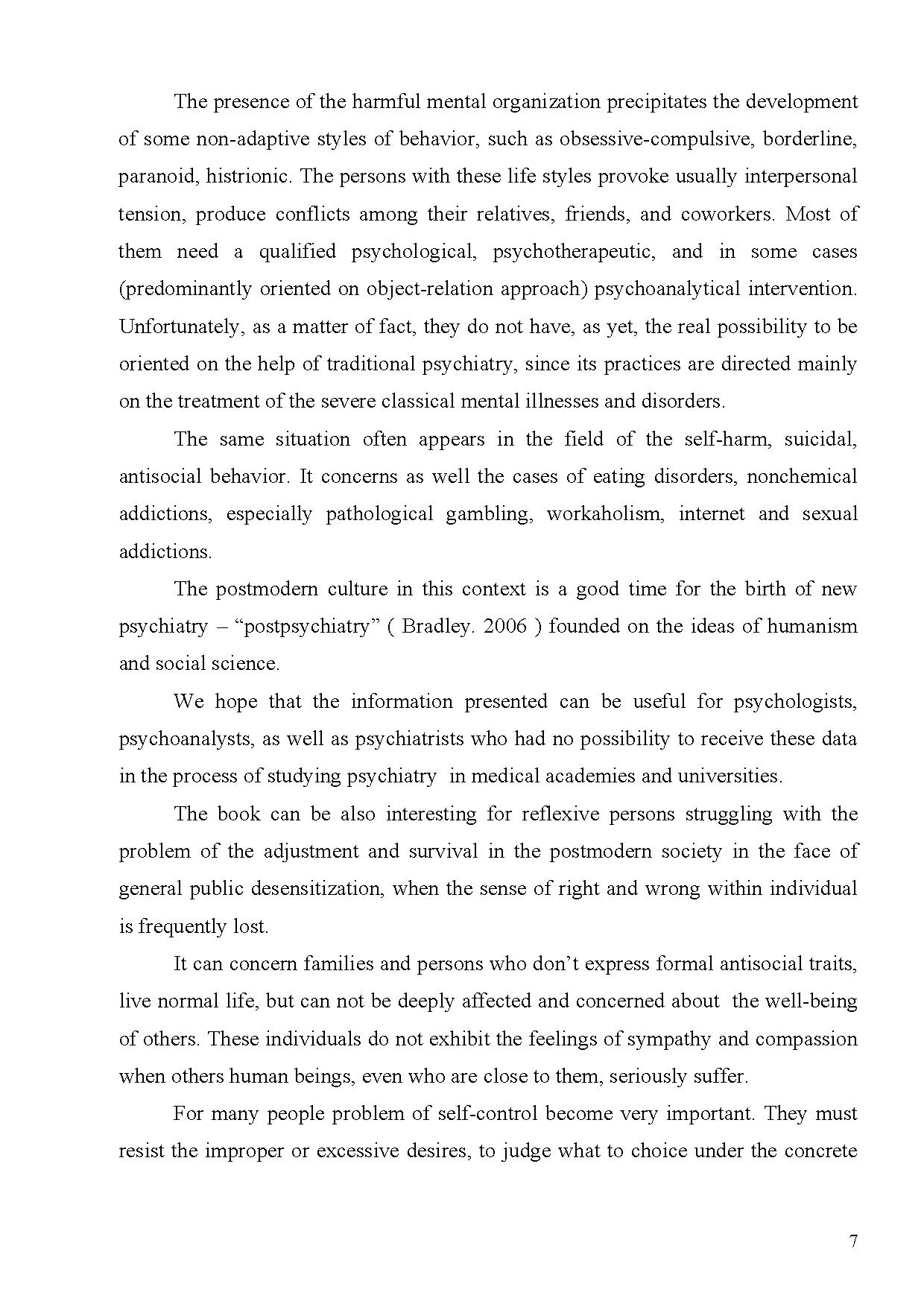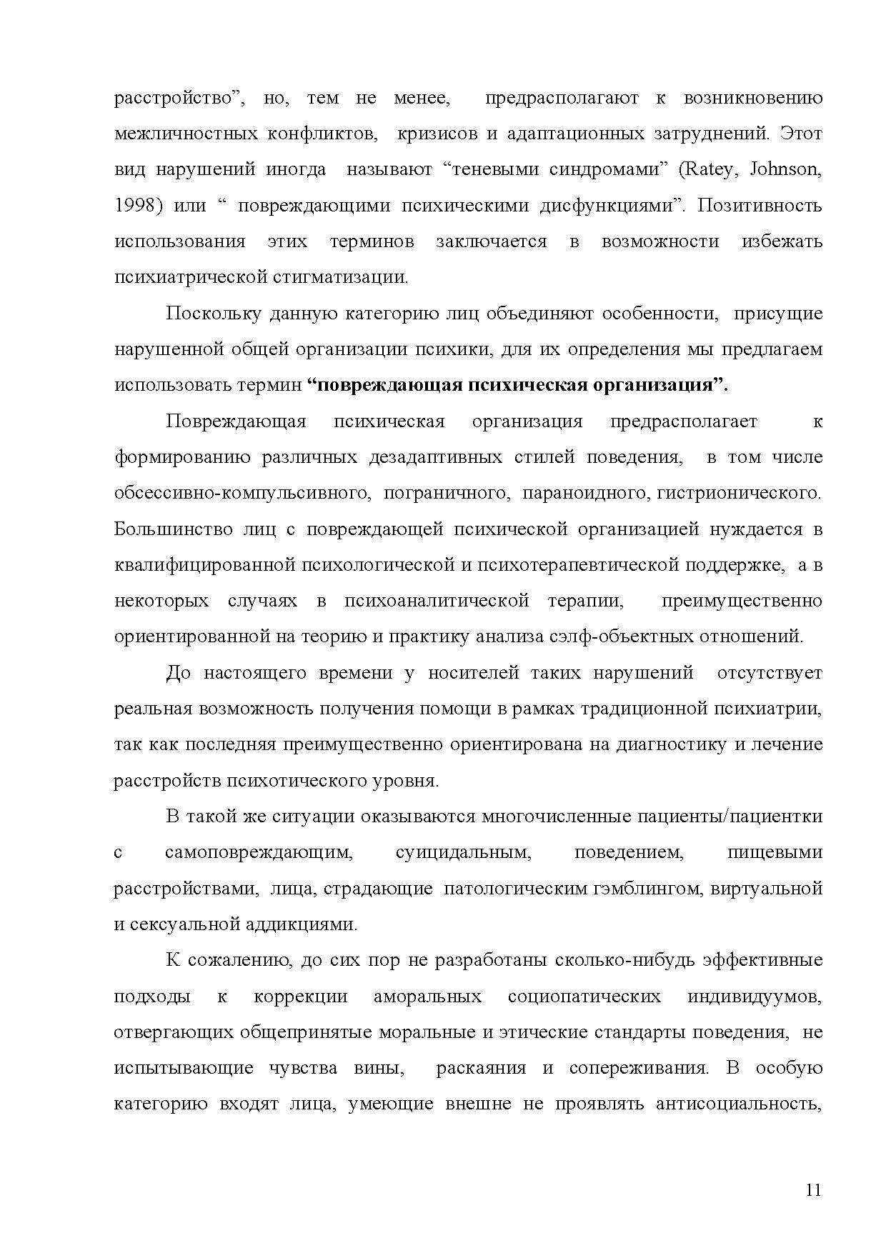 Впервые описанные варианты проявлений повреждающей психической организации свойственны не только лицам с психическими расстройствами, но и психически здоровым людям и в большинстве случаев являются реакцией на неразрешенные внутри/межличностные конфликты и трудные жизненные ситуации.