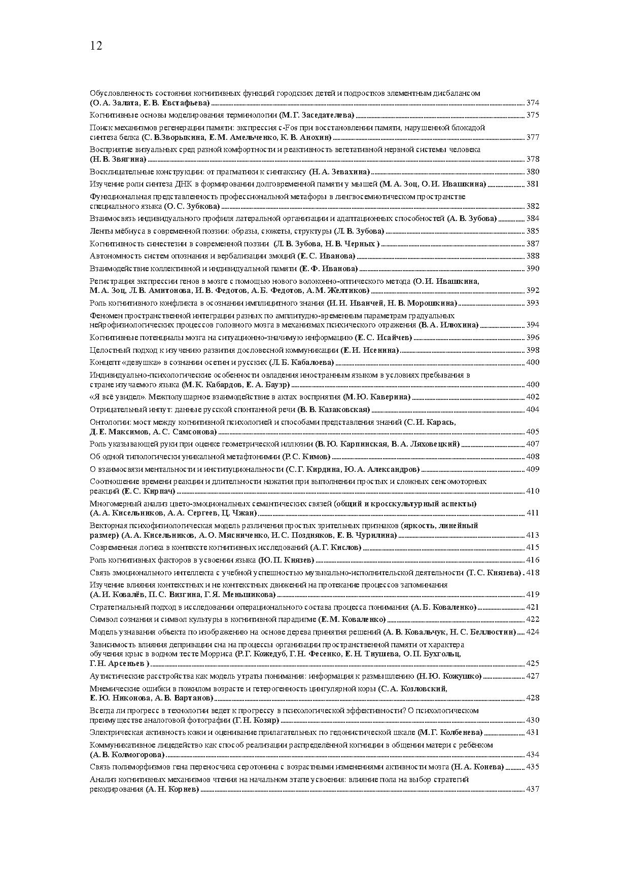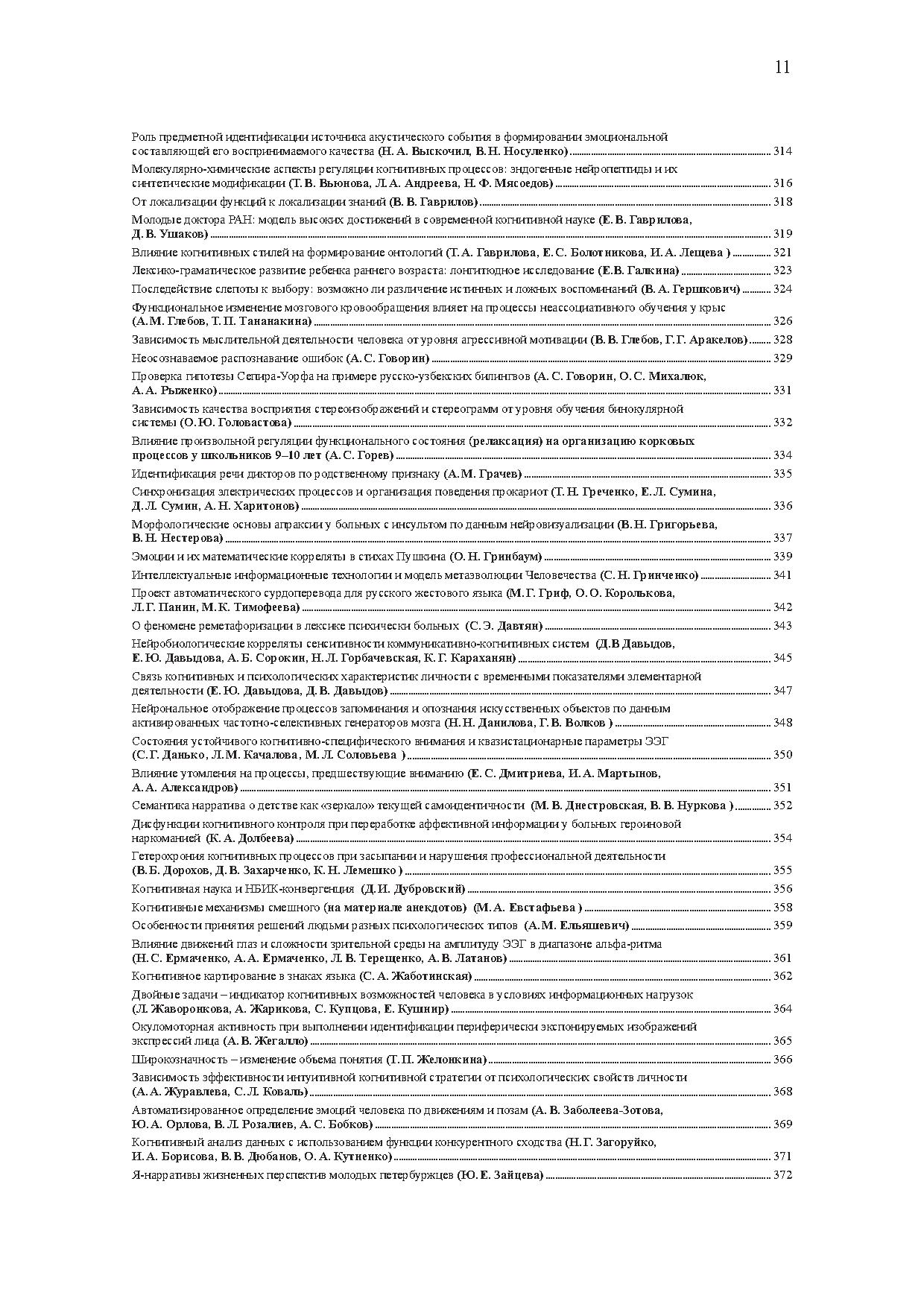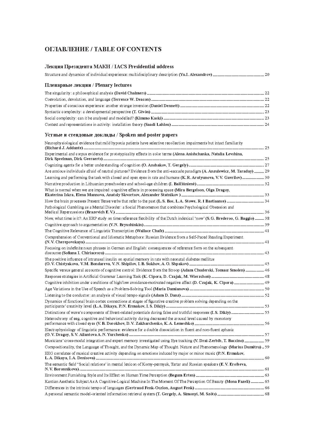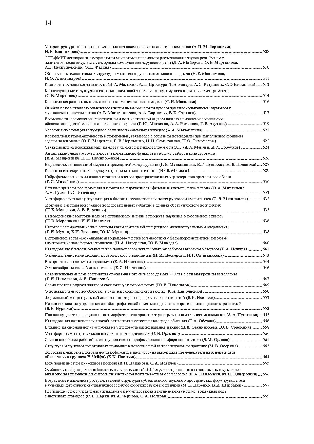 В центре дискуссий были проблемы обучения, интеллекта, восприятия, сознания, представления и приобретения знаний, специфики языка как средства познания и коммуникации, мозговых механизмов сложных форм поведения. Специализированные воркшопы были посвящены таким актуальным темам, как активное зрение и коммуникация, работа мозга при патологии, компьютерное моделирование, высшие когнитивные функции животных, процессы речепорождения, нейрокогнитивные механизмы языкового поведения, принятие решений. Материалы представляют собой тезисы лекций, устных и стендовых докладов, а также выступлений на воркшопах.