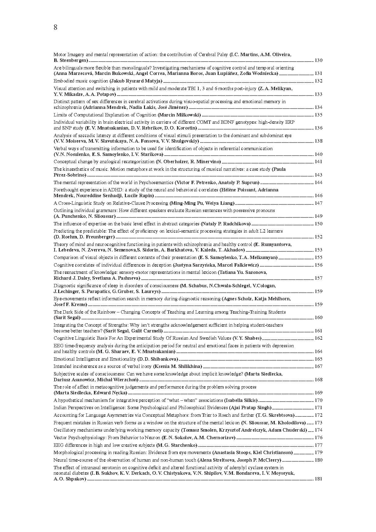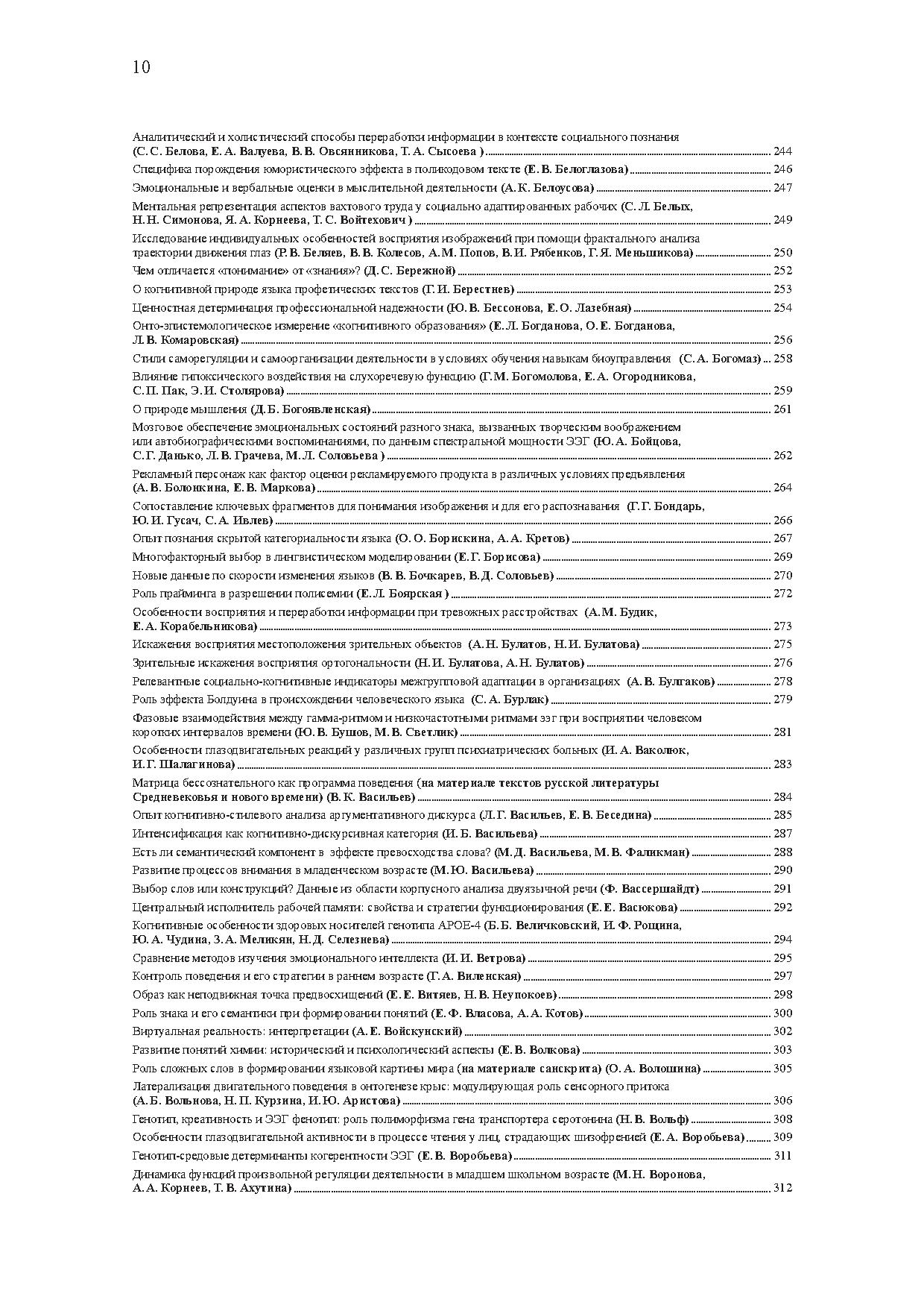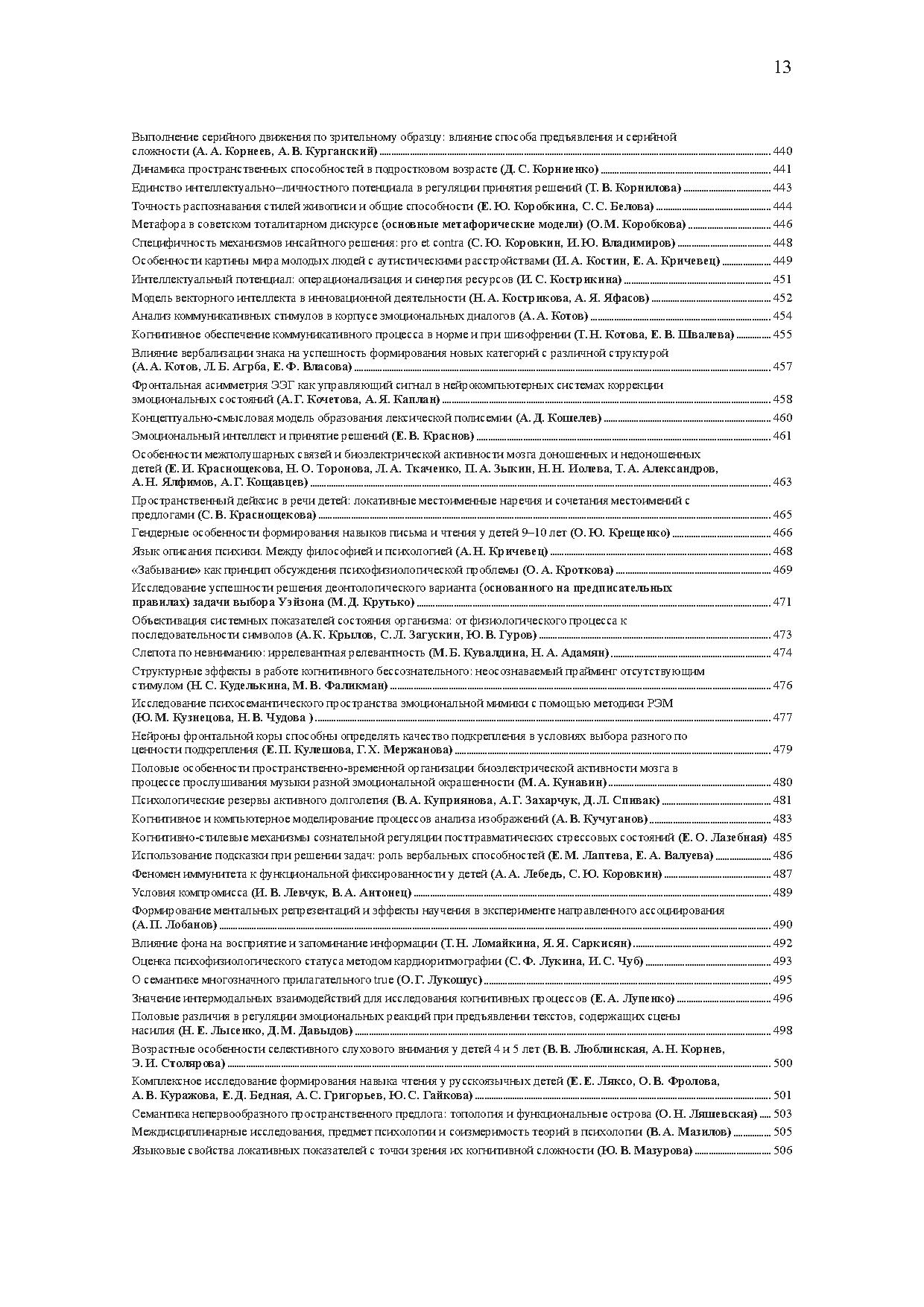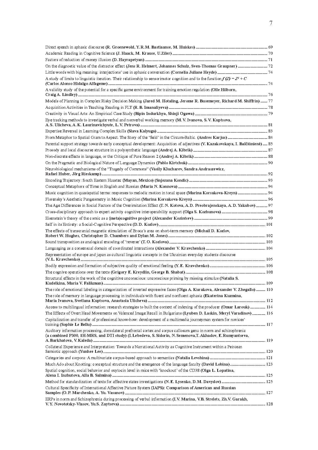 В центре дискуссий были проблемы обучения, интеллекта, восприятия, сознания, представления и приобретения знаний, специфики языка как средства познания и коммуникации, мозговых механизмов сложных форм поведения. Специализированные воркшопы были посвящены таким актуальным темам, как активное зрение и коммуникация, работа мозга при патологии, компьютерное моделирование, высшие когнитивные функции животных, процессы речепорождения, нейрокогнитивные механизмы языкового поведения, принятие решений. Материалы представляют собой тезисы лекций, устных и стендовых докладов, а также выступлений на воркшопах.