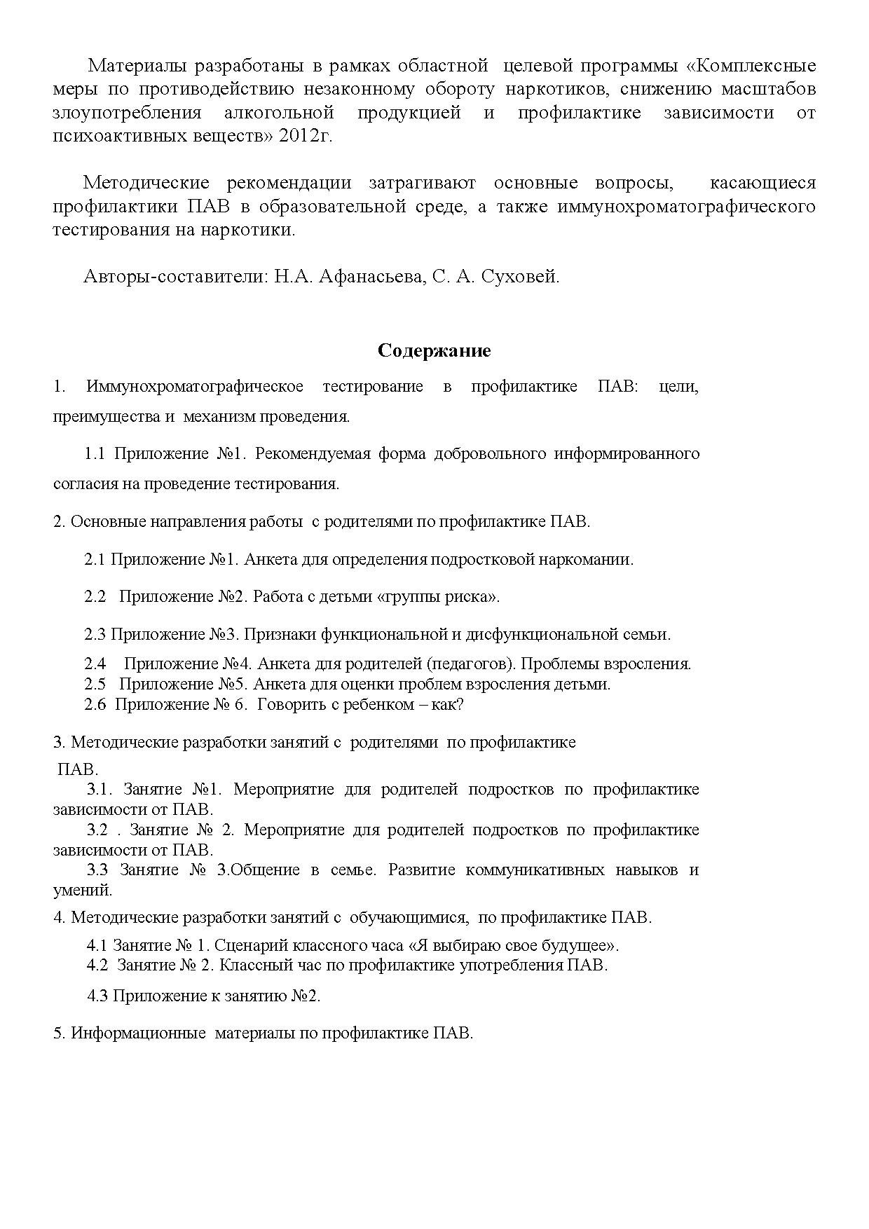 Материалы разработаны в рамках областной целевой программы «Комплексные меры по противодействию незаконному обороту наркотиков, снижению масштабов злоупотребления алкогольной продукцией и профилактике зависимости от психоактивных веществ» 2012г.