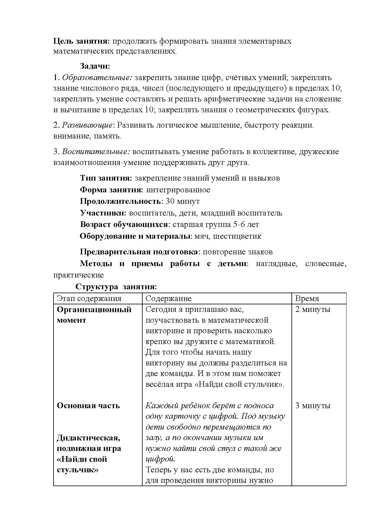 Разработка конспекта занятия по ФЭМП (викторина). Тема: «Знатоки»