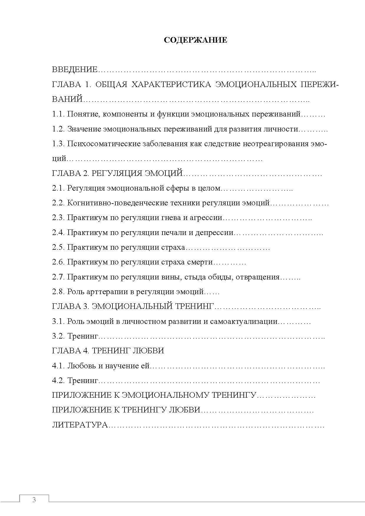 Она содержит как ряд теоретических положений, касающихся регуляции эмоций, так и практические рекомендации, техники и упражнения, в том числе и авторские, направленные на преодоление нежелательных эмоциональных переживаний, а также эмоциональный тренинг, позволяющий осознать эмоции гнева, страха, печали и др. и совладать с ними; тренинг любви, развивающий способность любить.