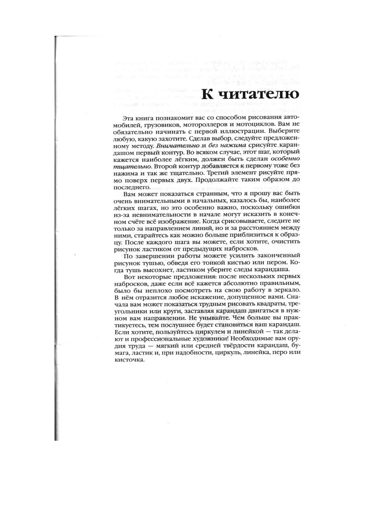 Содержит пошаговые инструкции для практического рисования различных транспортных средств (легковые автомашины, грузовики, мотоциклы, цементовозы, миниавтобусы, велосипеды и пр.) в процессе освоения искусства черно-белой и полутоновой графики.