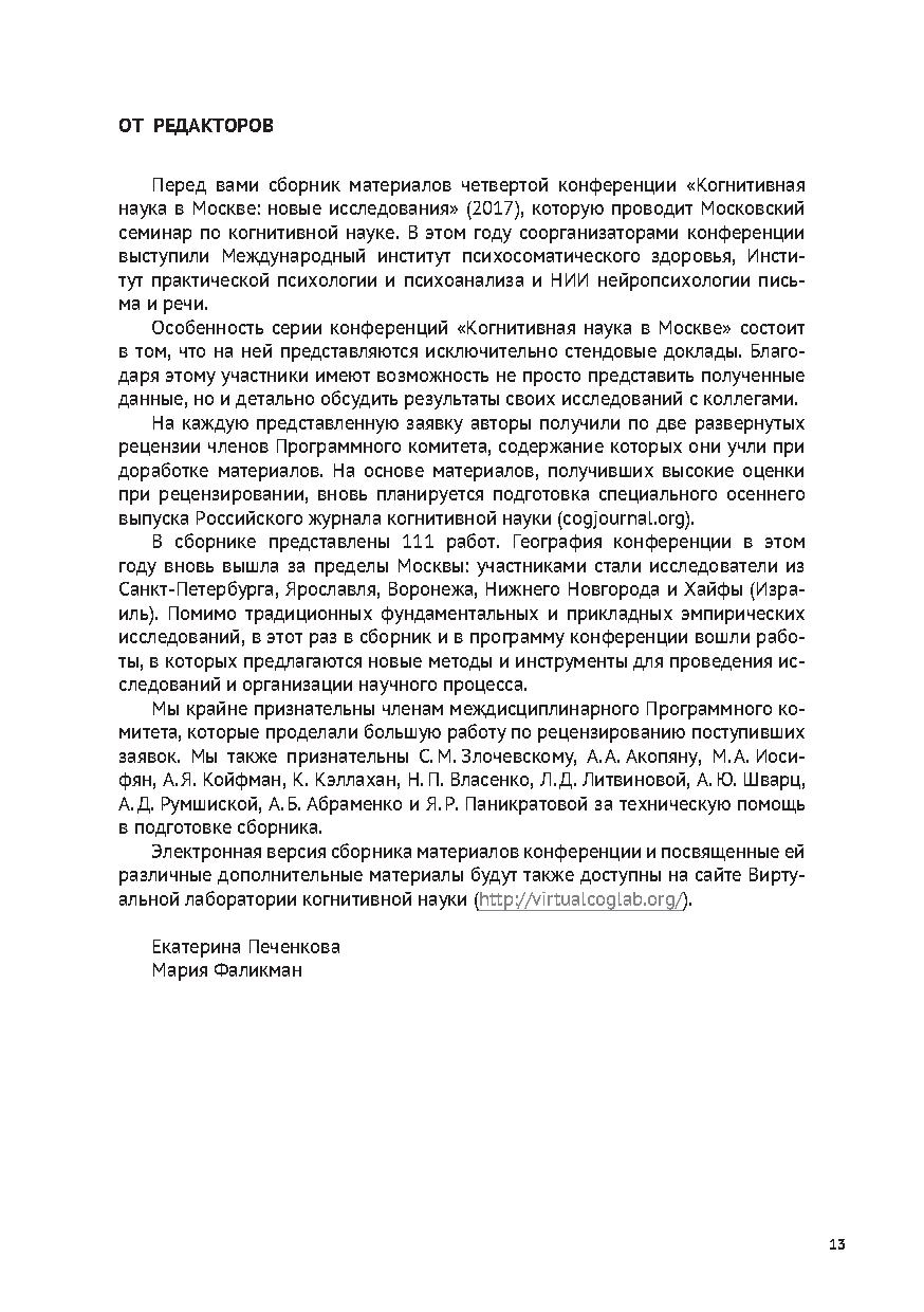 Перед вами сборник материалов четвертой конференции «Когнитивная наука в Москве: новые исследования» (2017), которую проводит Московский семинар по когнитивной науке. В этом году соорганизаторами конференции выступили Международный институт психосоматического здоровья, Институт практической психологии и психоанализа и НИИ нейропсихологии письма и речи.