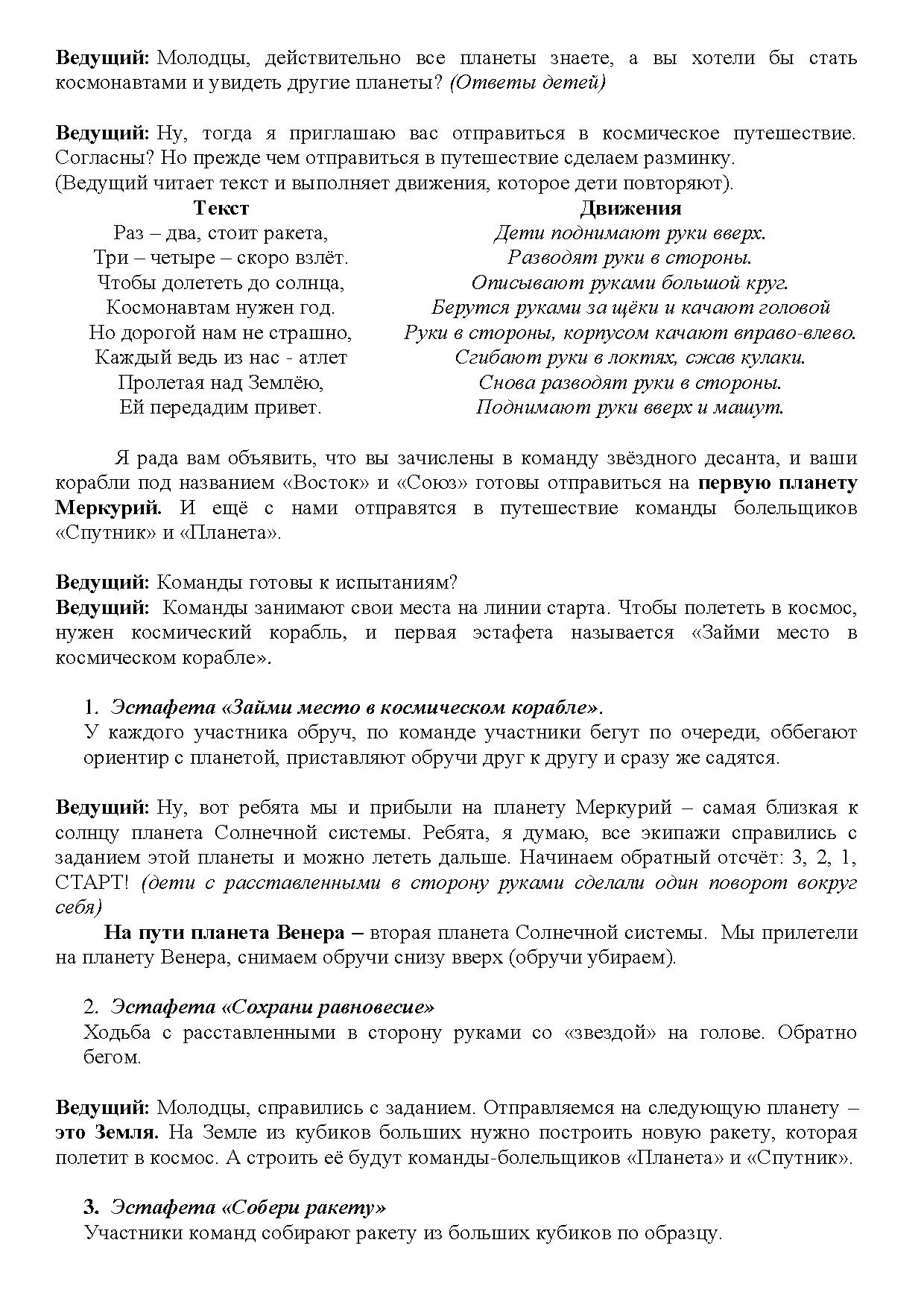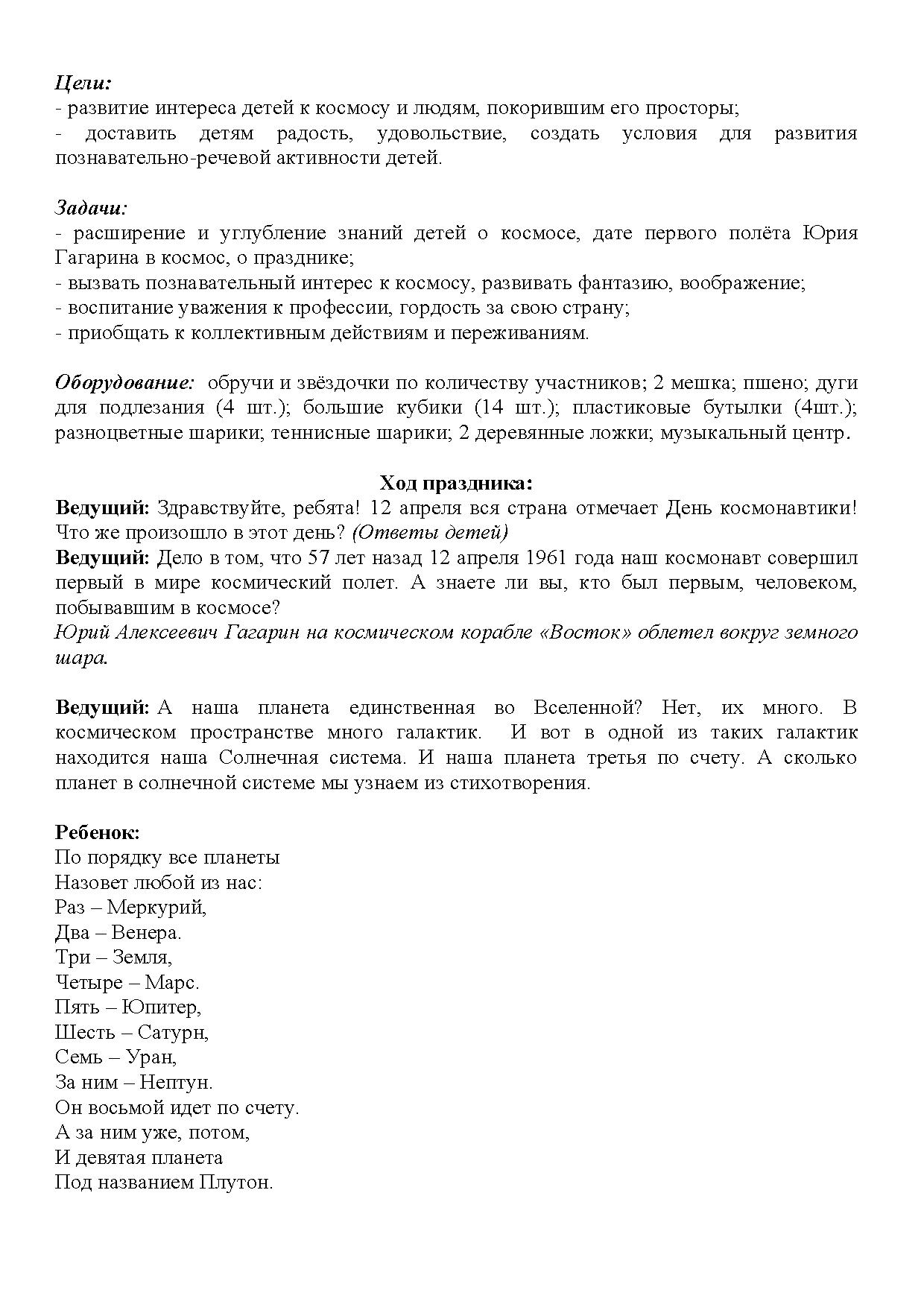 - расширение и углубление знаний детей о космосе, дате первого полёта Юрия Гагарина в космос, о празднике;