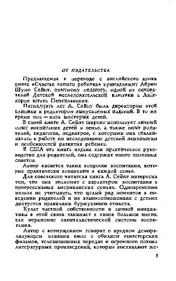 Для советского читателя книга А. Сейпт интересна тем, что она знакомит с характером воспитания в прогрессивных американских семьях. Одновременно нельзя не учитывать, что целый ряд моментов в поведении родителей и их взаимоотношениях с детьми диктуется правилами буржуазного этикета.