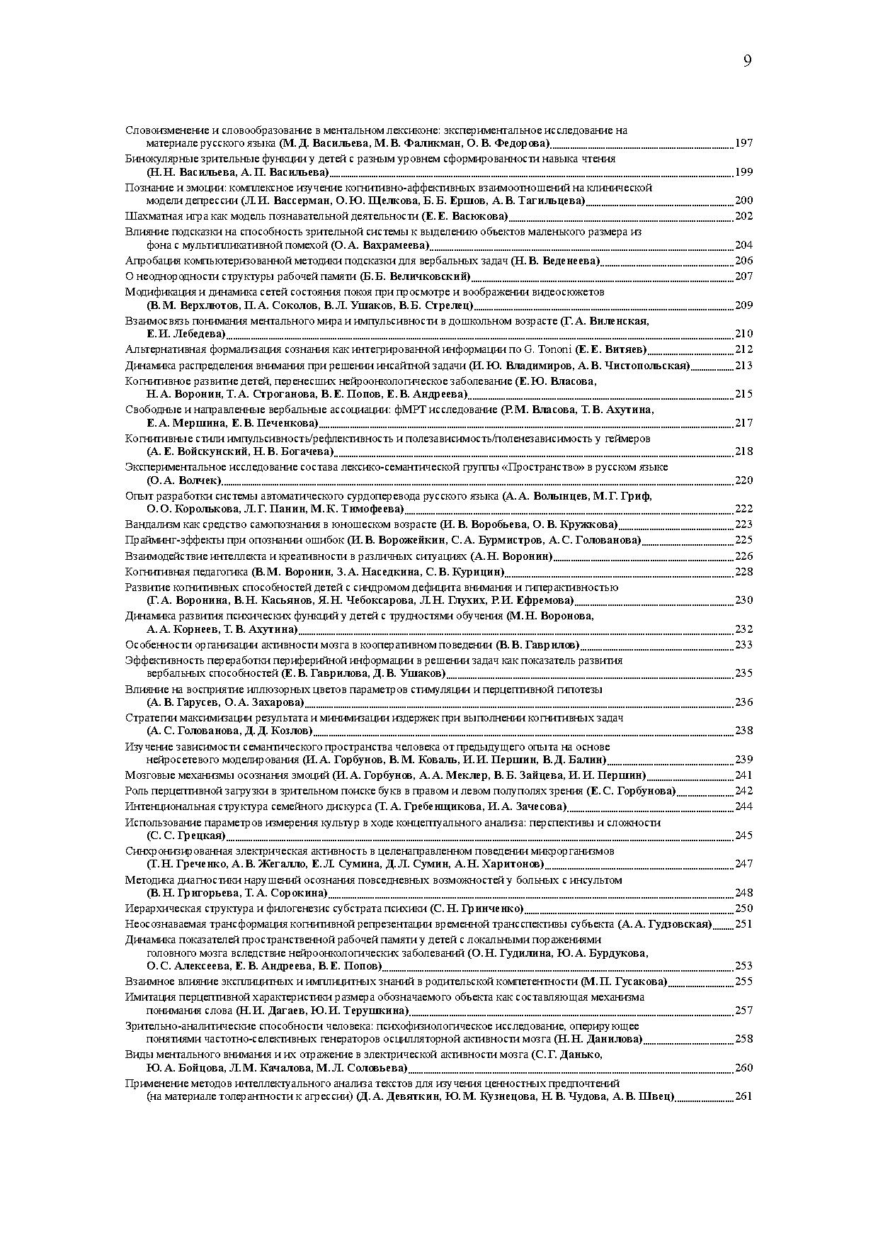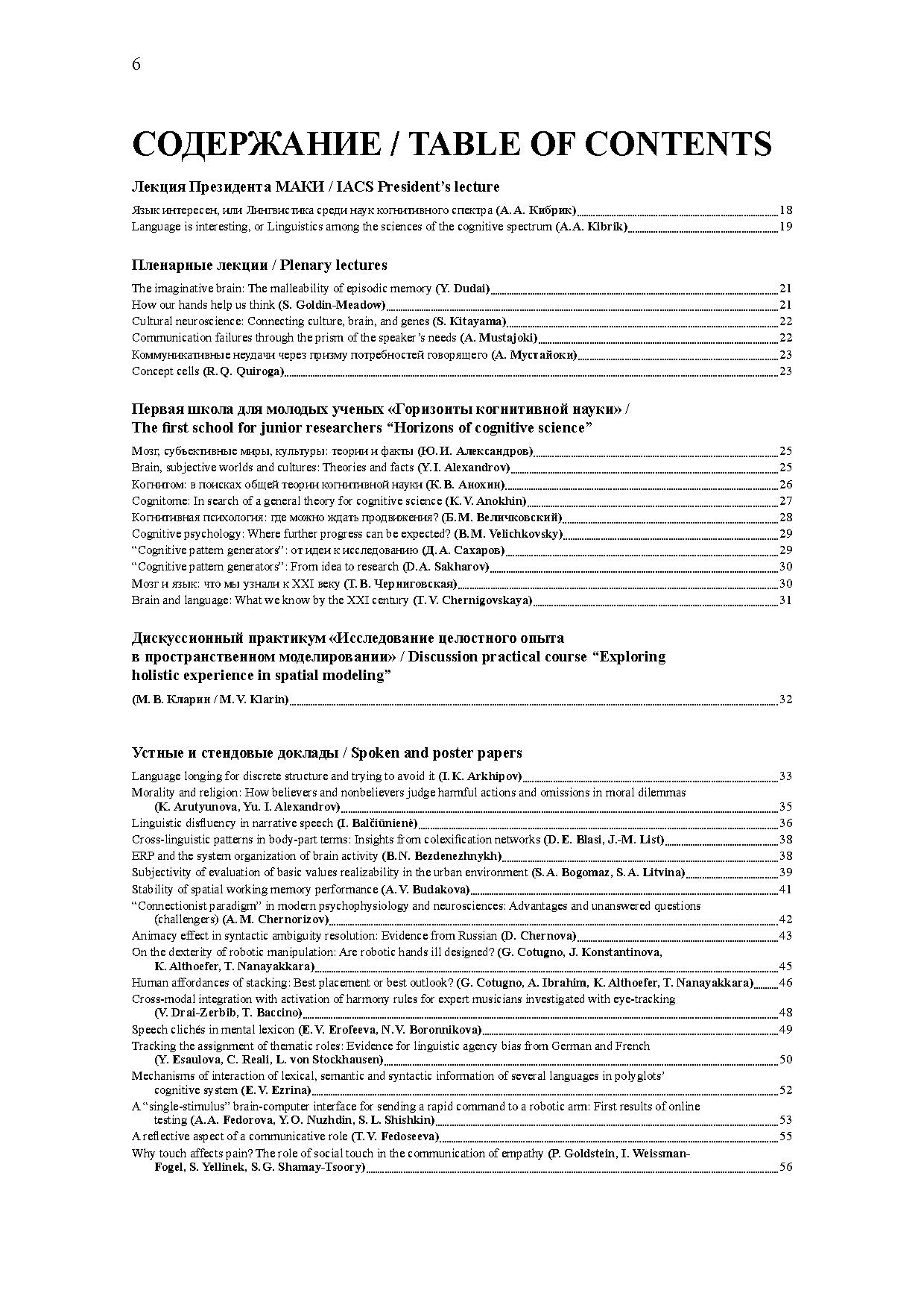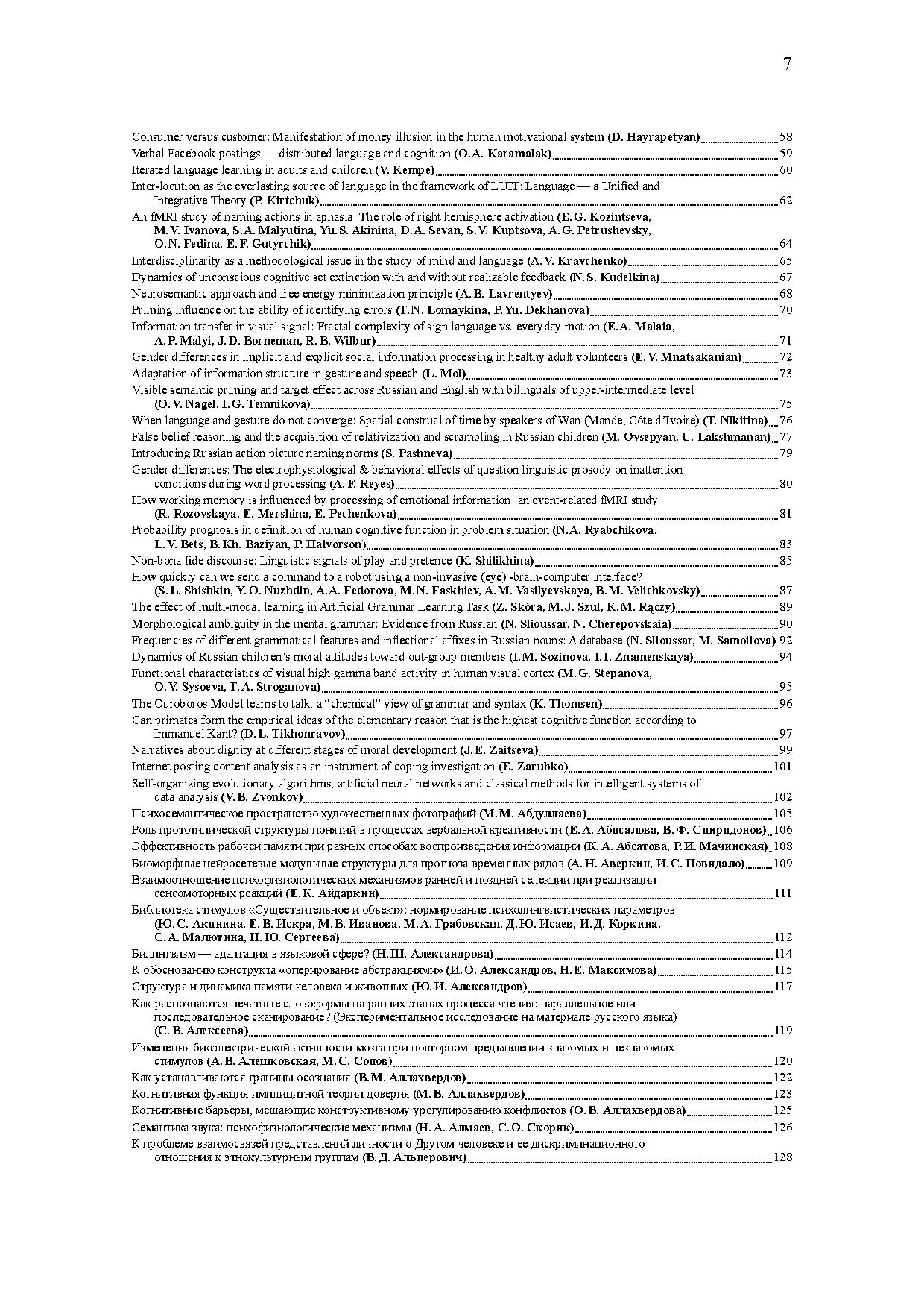 В центре дискуссий на конференции — проблемы обучения, интеллекта, восприятия, сознания, представления и приобретения знаний, специфики языка как средства познания и коммуникации, мозговых механизмов сложных форм поведения. В программе конференции также серия специализированных воркшопов, посвященных таким актуальным темам, как концептуальные структуры, особенности развития при билингвизме, проблема зрелости человека, языковая коммуникация, принятие решений. Материалы представляют собой тезисы пленарных лекций, устных и стендовых докладов, а также выступлений на воркшопах.