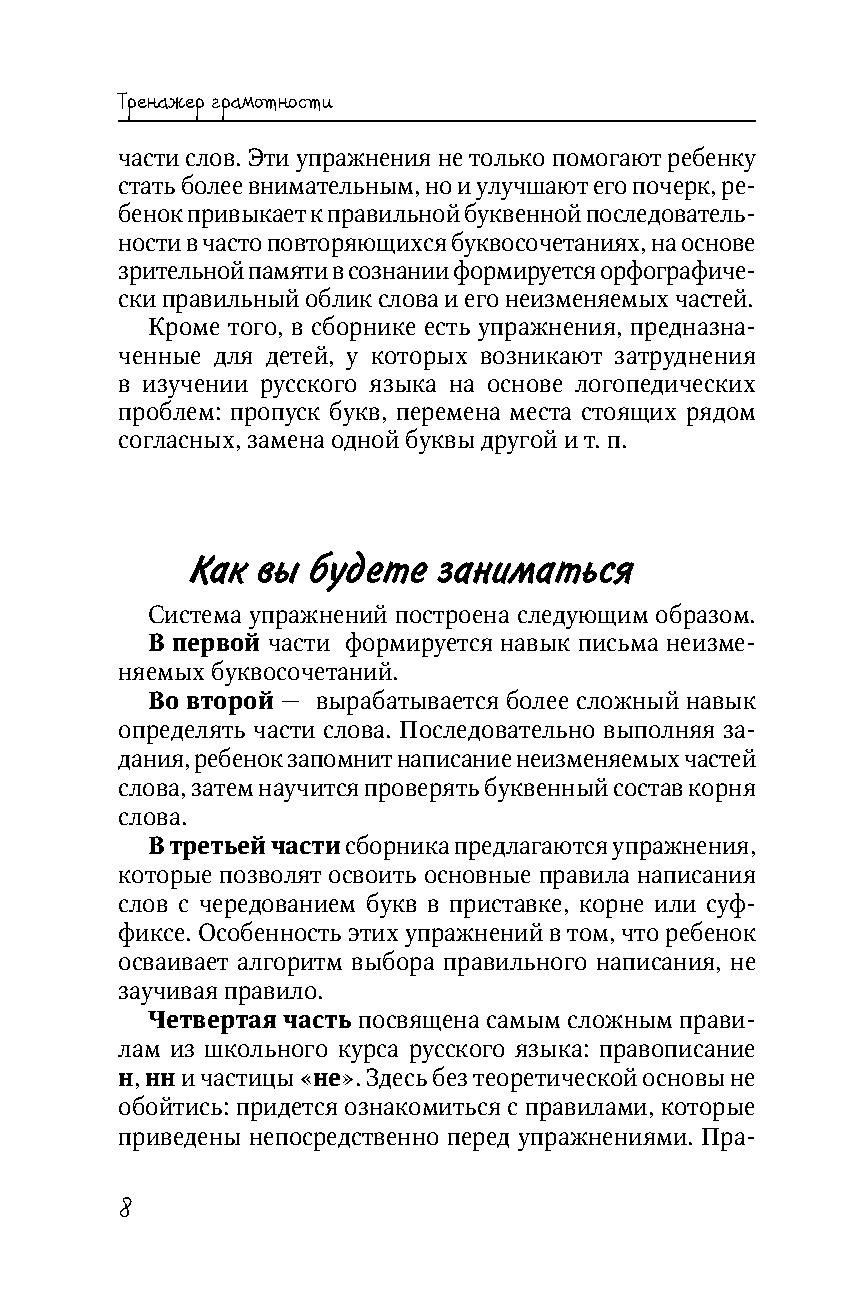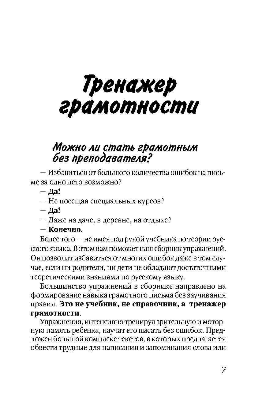 Эта книга поможет вашему ребенку «набить руку» в правописании. В свободное время, в выходные, на каникулах дайте эту книгу ребенку и попросите сделать два-три упражнения, а затем проверить себя по ключу — и очень скоро он начнет писать «на автомате», подсознательно чувствуя, какую букву нужно вставить и где необходима запятая. Книга написана учителем русского языка с многолетним стажем преподавания и репетиторства.