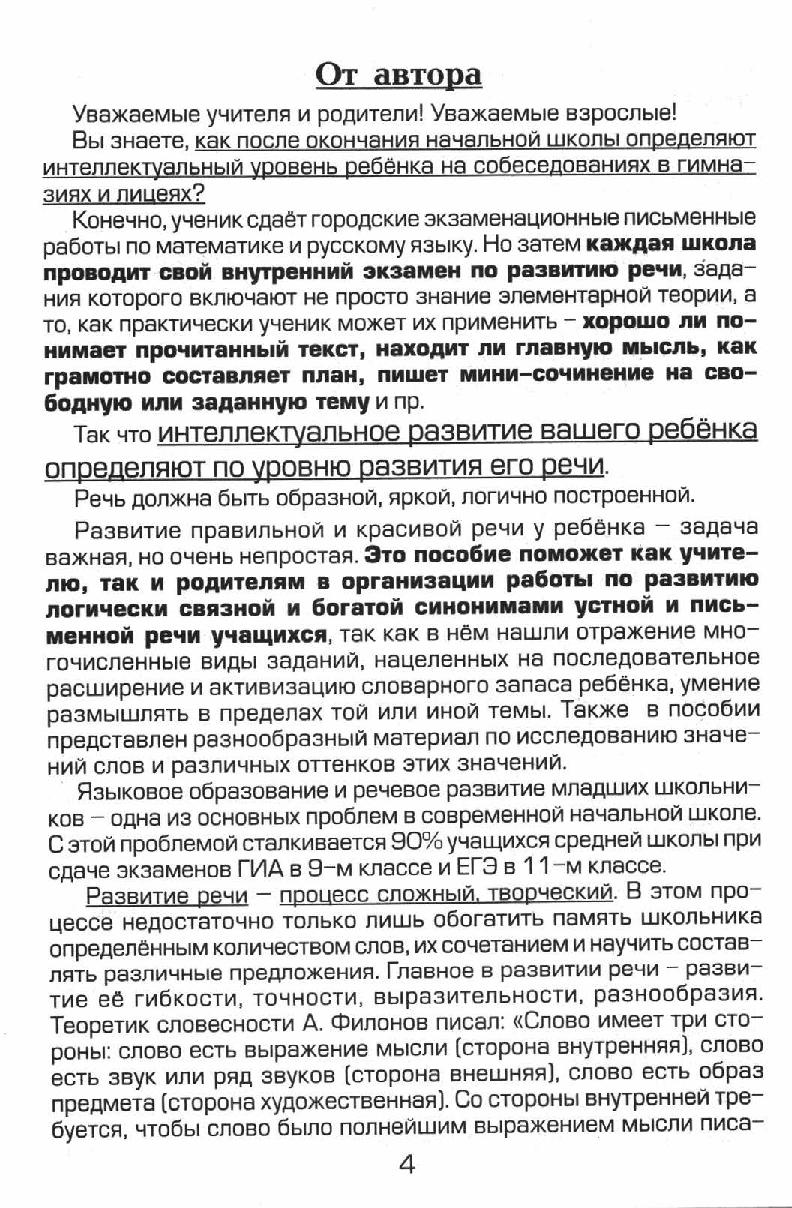 Развитие правильной и красивой речи у ребёнка - задача важная, но очень непростая. Это пособие поможет как учителю, так и родителям в организации работы по развитию логически связной и богатой синонимами устной и письменной речи учащихся, так как в нём нашли отражение многочисленные виды заданий, нацеленных на последовательное расширение и активизацию словарного запаса ребёнка, умение размышлять в пределах той или иной темы.