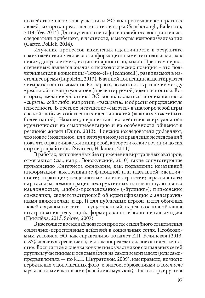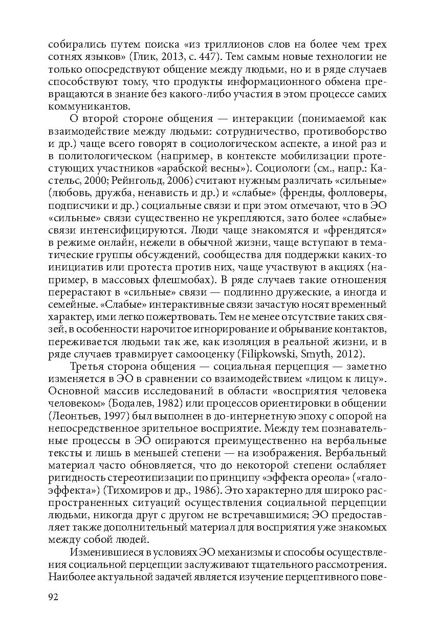 Анализируется специфика процессов социальной перцепции в условиях электронного — опосредствованного Интернетом — общения. Особое внимание уделяется механизмам управления процессами социальной перцепции в социальных сетях. Выявляется основной механизм такого управления— конструирование самопрезентаций, в том числе множественных и альтернативных. Самопрезентации включают вербальный и визуальный (фотографии, видеоизображения) материал, а часто также и аудиофайлы.