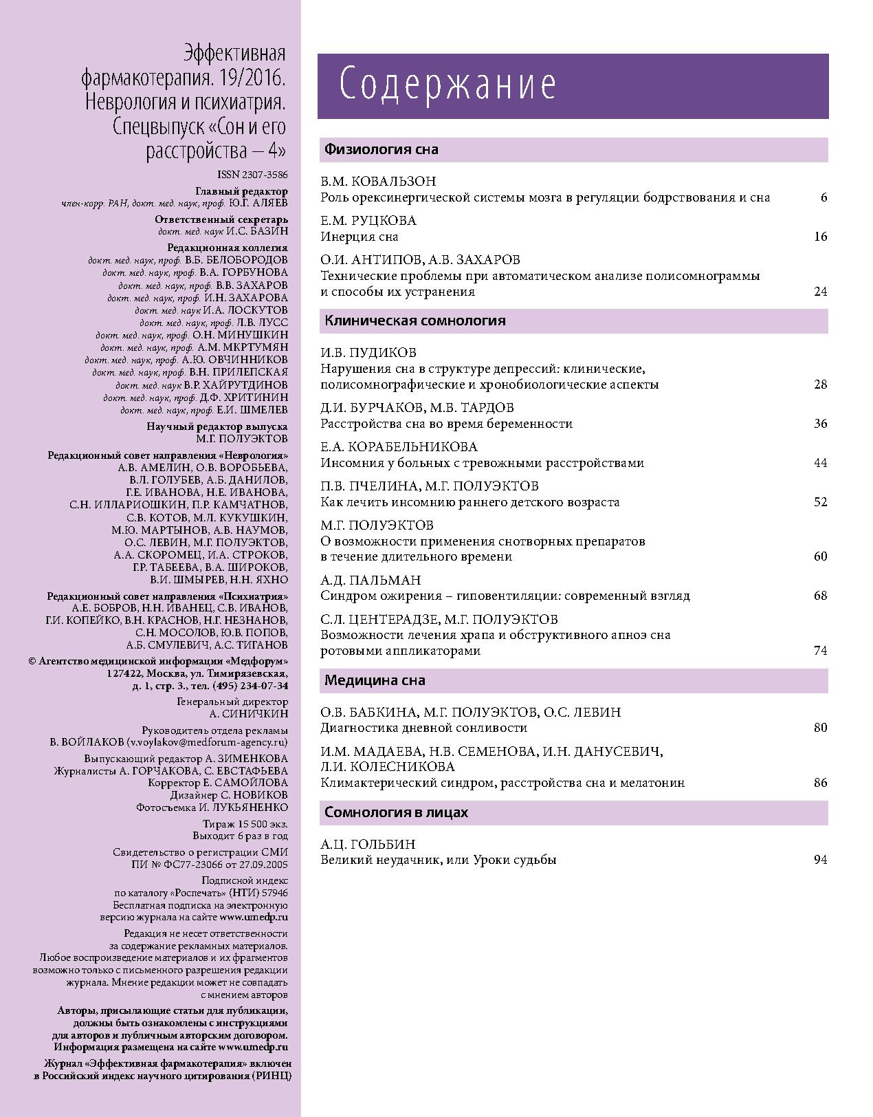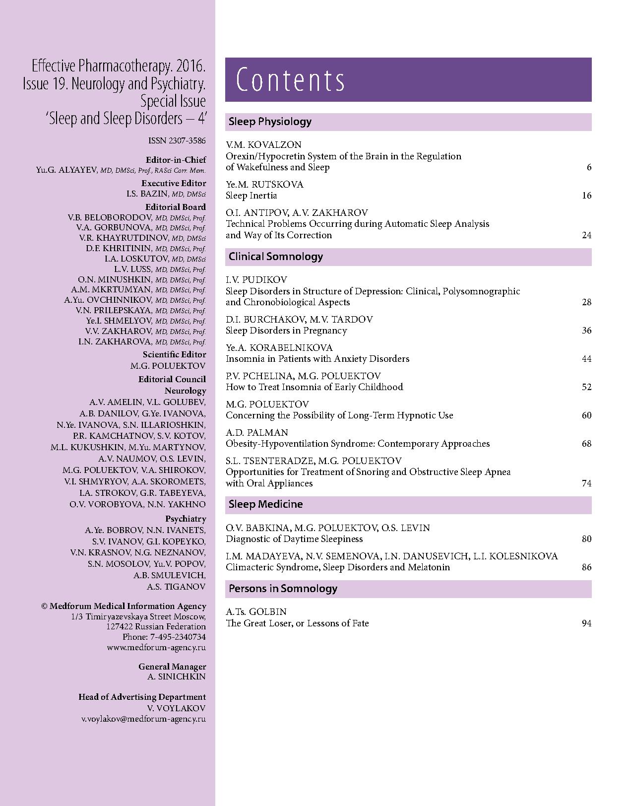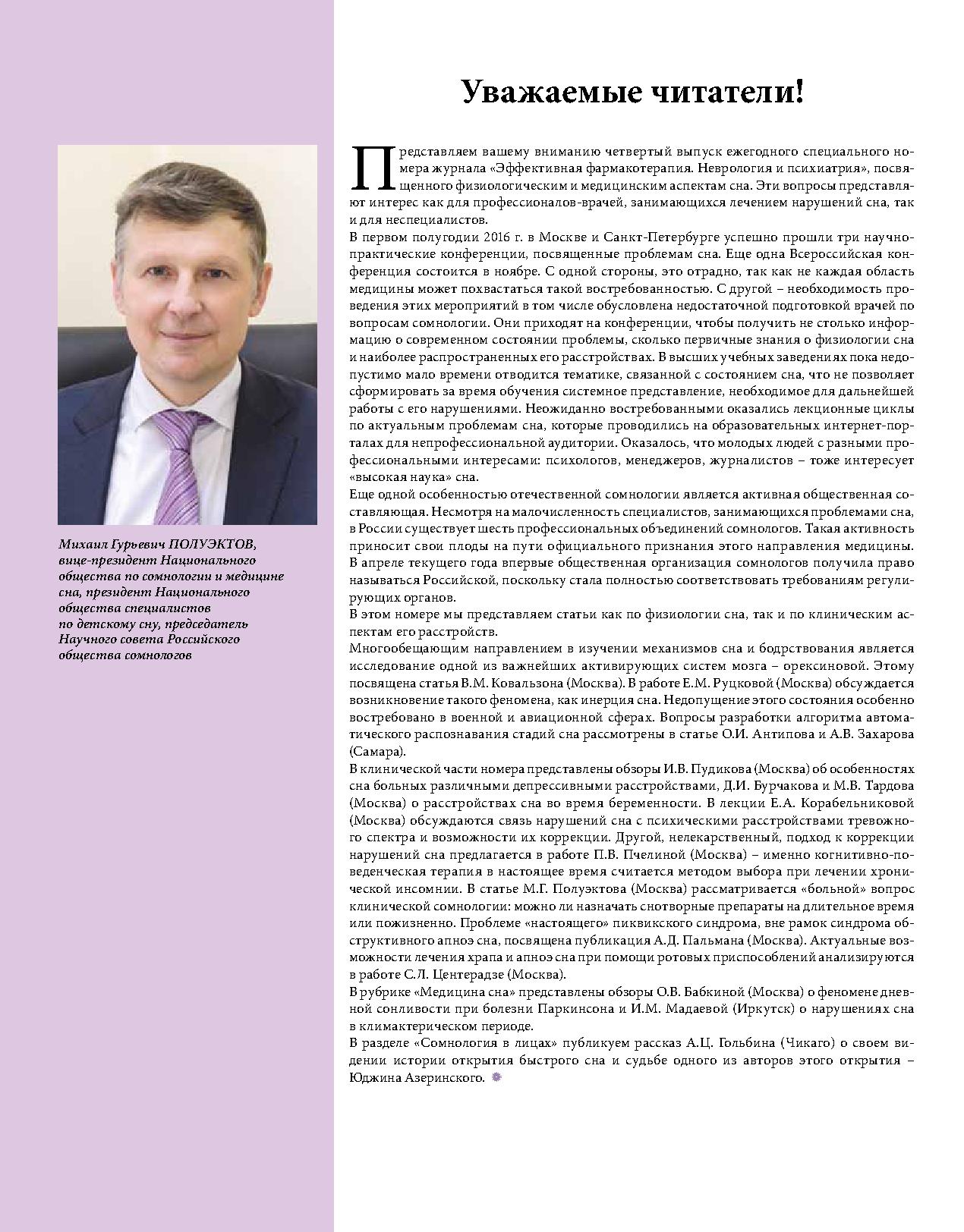 Представляем вашему вниманию четвертый выпуск ежегодного специального номера журнала «Эффективная фармакотерапия. Неврология и психиатрия», посвященного физиологическим и медицинским аспектам сна. Эти вопросы представляют интерес как для профессионалов-врачей, занимающихся лечением нарушений сна, так и для неспециалистов.