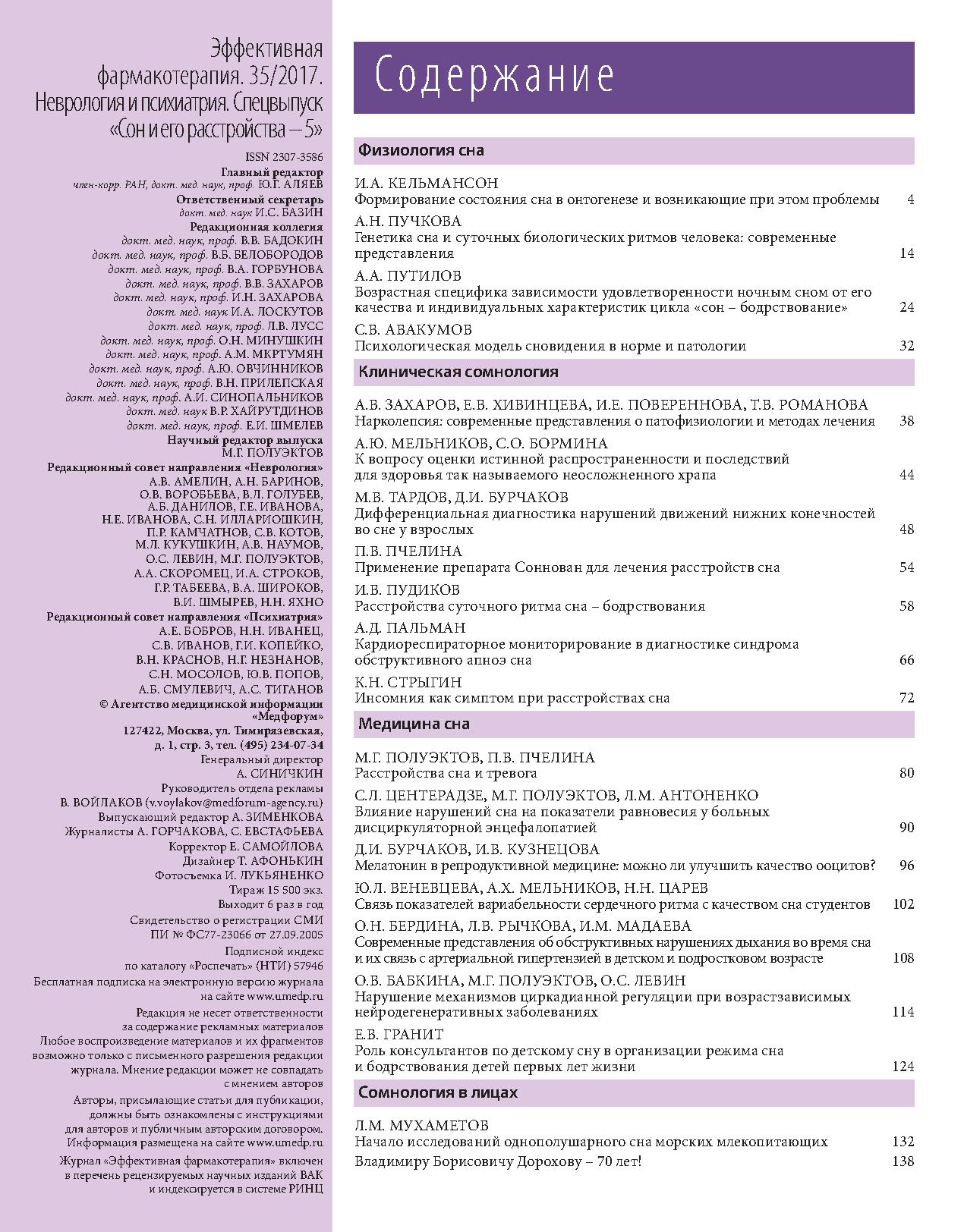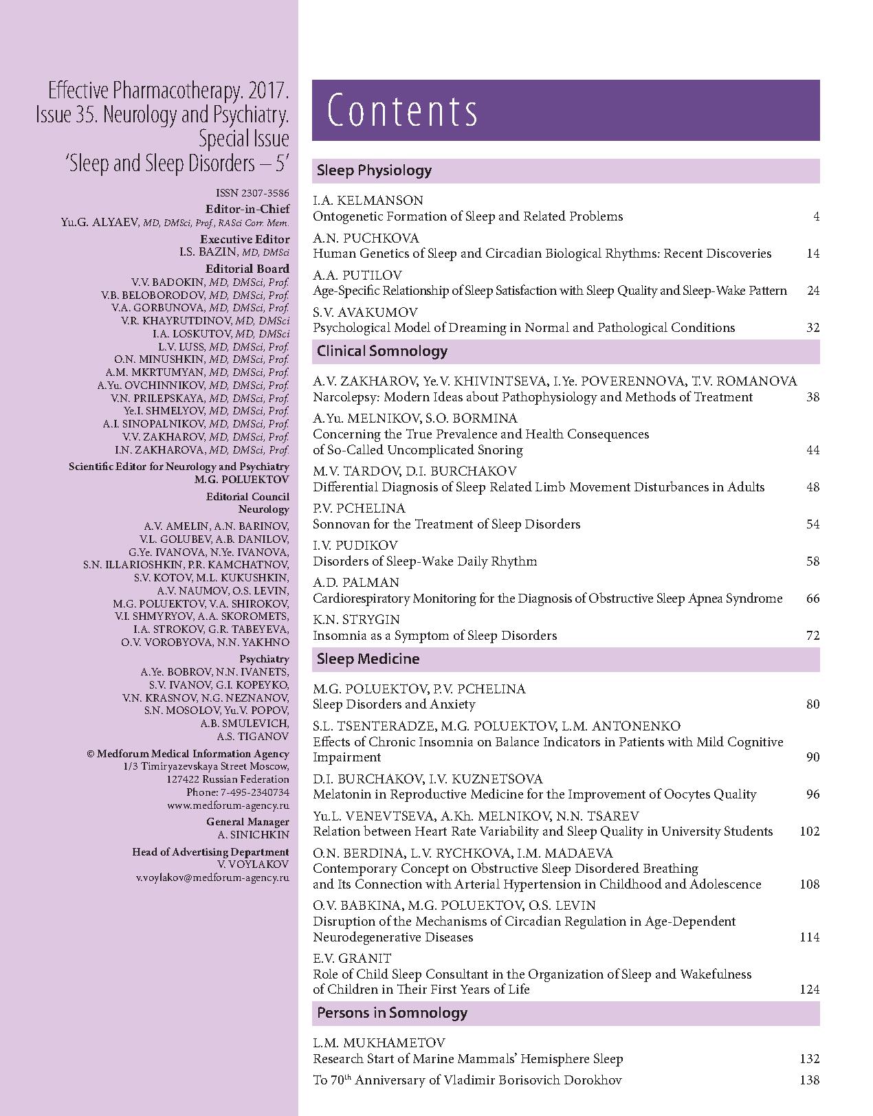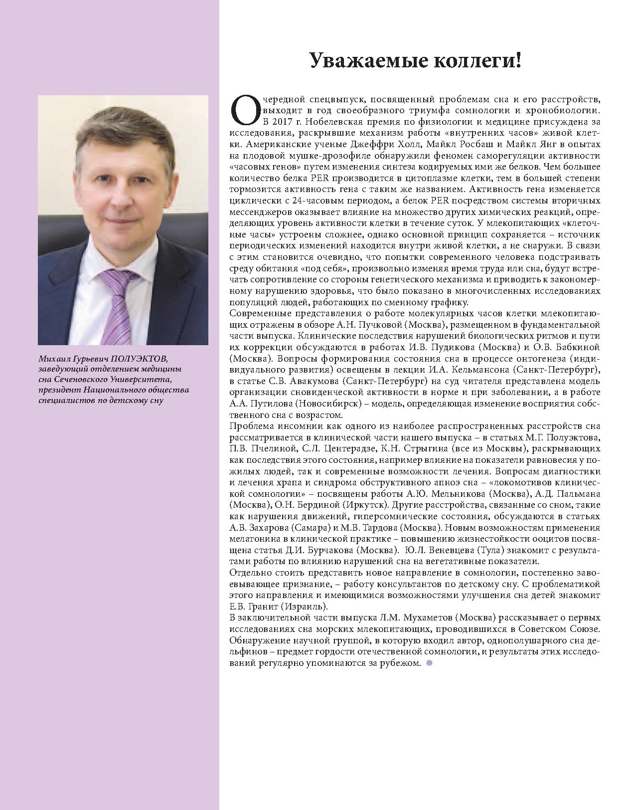 Очередной спецвыпуск, посвященный проблемам сна и его расстройств, выходит в год своеобразного триумфа сомнологии и хронобиологии. В 2017 г. Нобелевская премия по физиологии и медицине присуждена за исследования, раскрывшие механизм работы «внутренних часов» живой клетки. Американские ученые Джеффри Холл, Майкл Росбаш и Майкл Янг в опытах на плодовой мушке-дрозофиле обнаружили феномен саморегуляции активности «часовых генов» путем изменения синтеза кодируемых ими же белков. Чем большее количество белка PER производится в цитоплазме клетки, тем в большей степени тормозится активность гена с таким же названием.