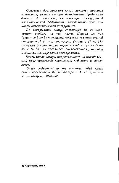 По замыслу авторов он должен служить, во-первых, учебником для первого знакомства с предметом, во-вторых, справочником по статистической технике для людей, которые уже владеют соответствующими идеями и методами, и, в-третьих, руководством по планированию экспериментов и квалифицированной интерпретации их результатов в реальных исследовательских задачах.