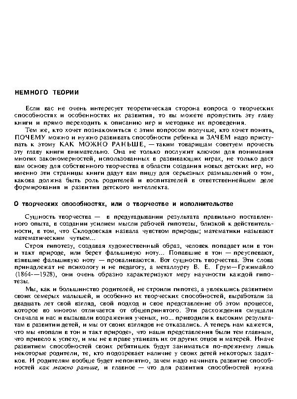 Автор книги, педагог-новатор, педагогические взгляды которого широко известны не только в нашей стране, но и за рубежом, рассказывает об опыте применения и использования специальных игр, позволяющих успешно развивать творческие способности ребенка.
