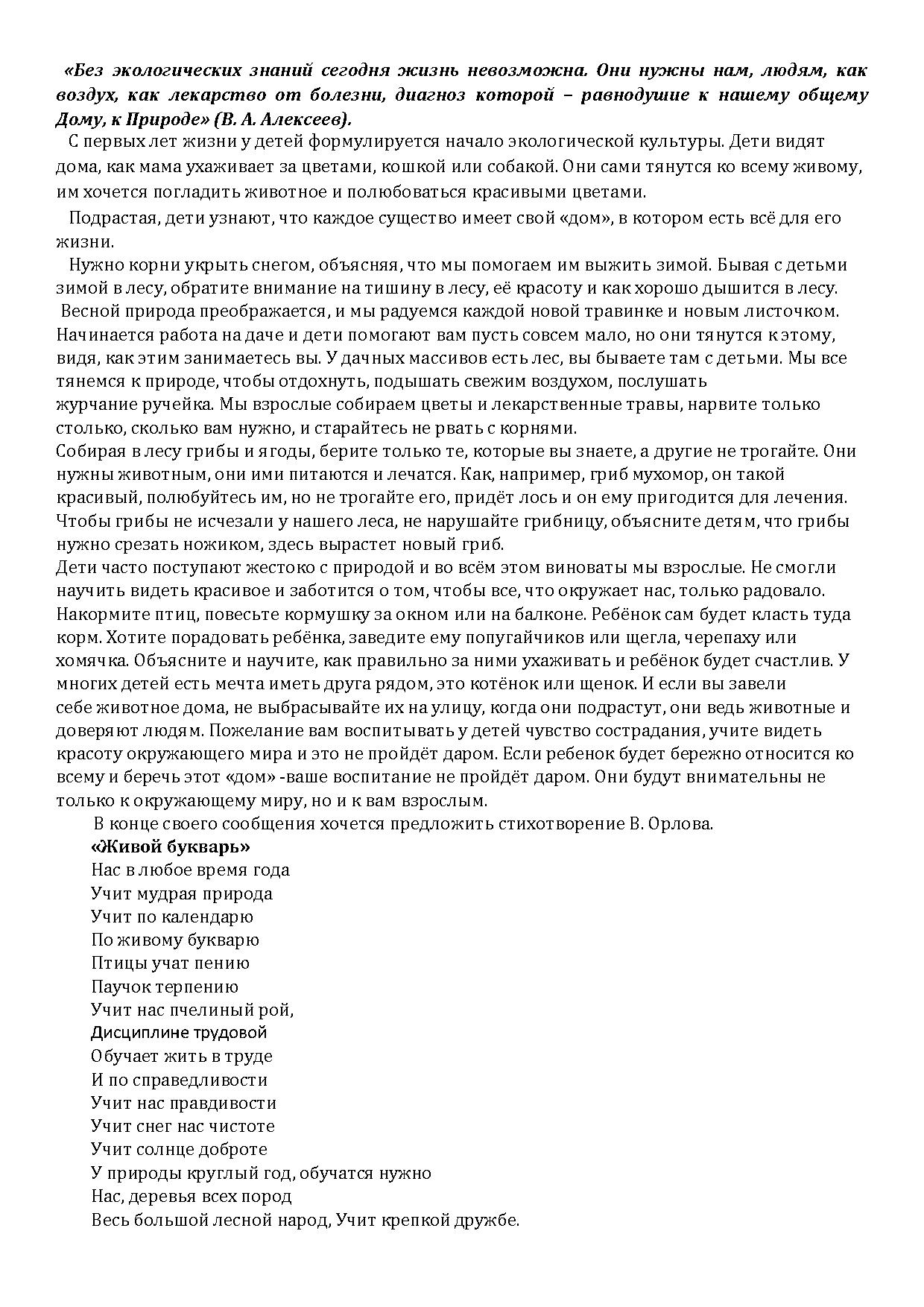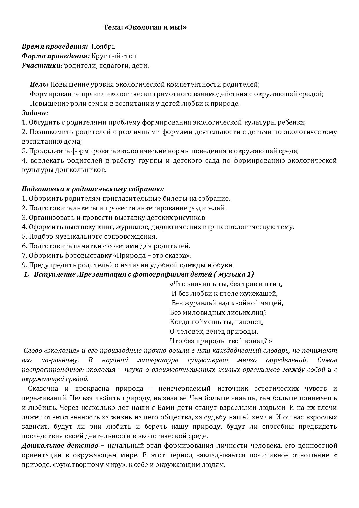 1. Обсудить с родителями проблему формирования экологической культуры ребенка;