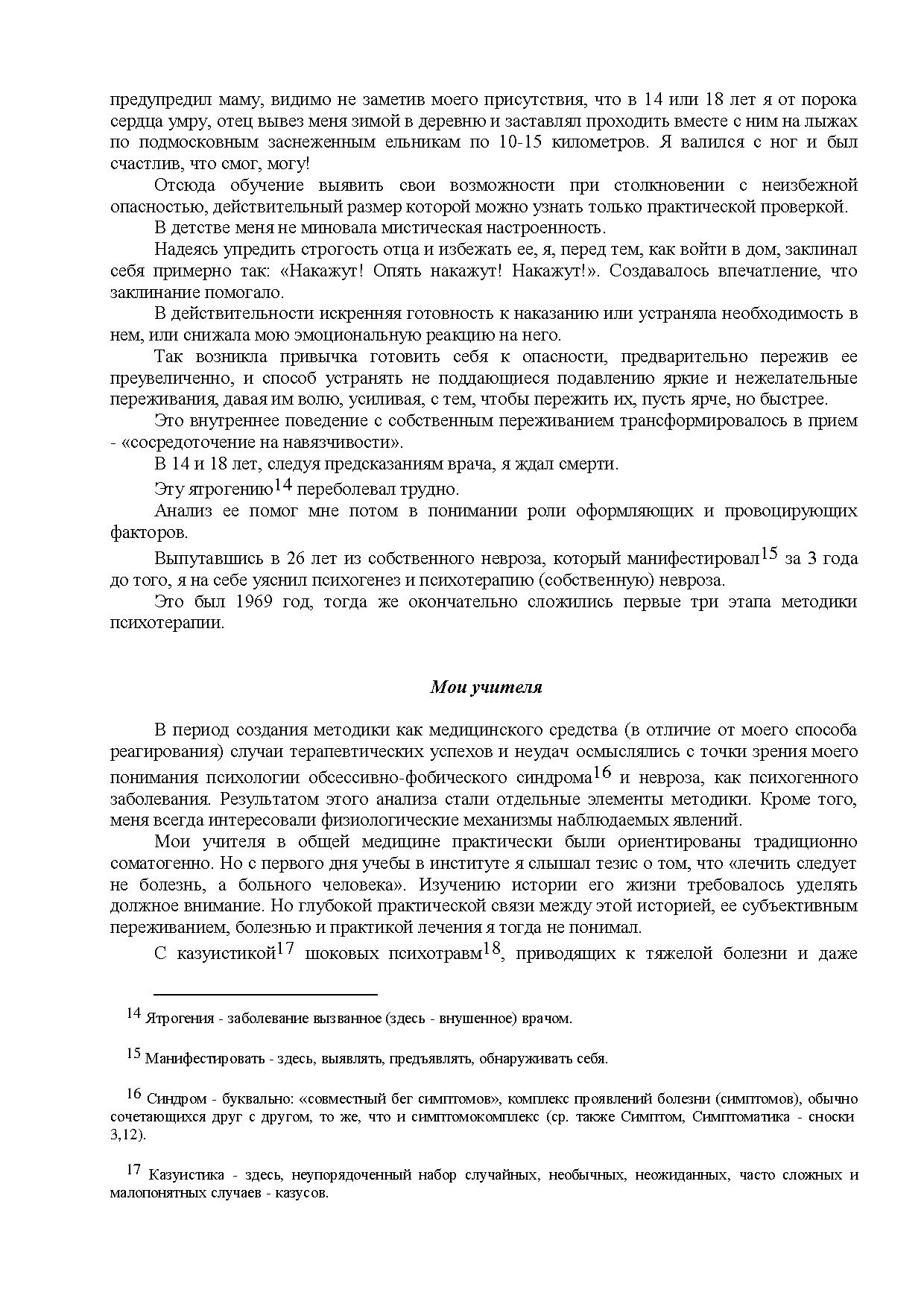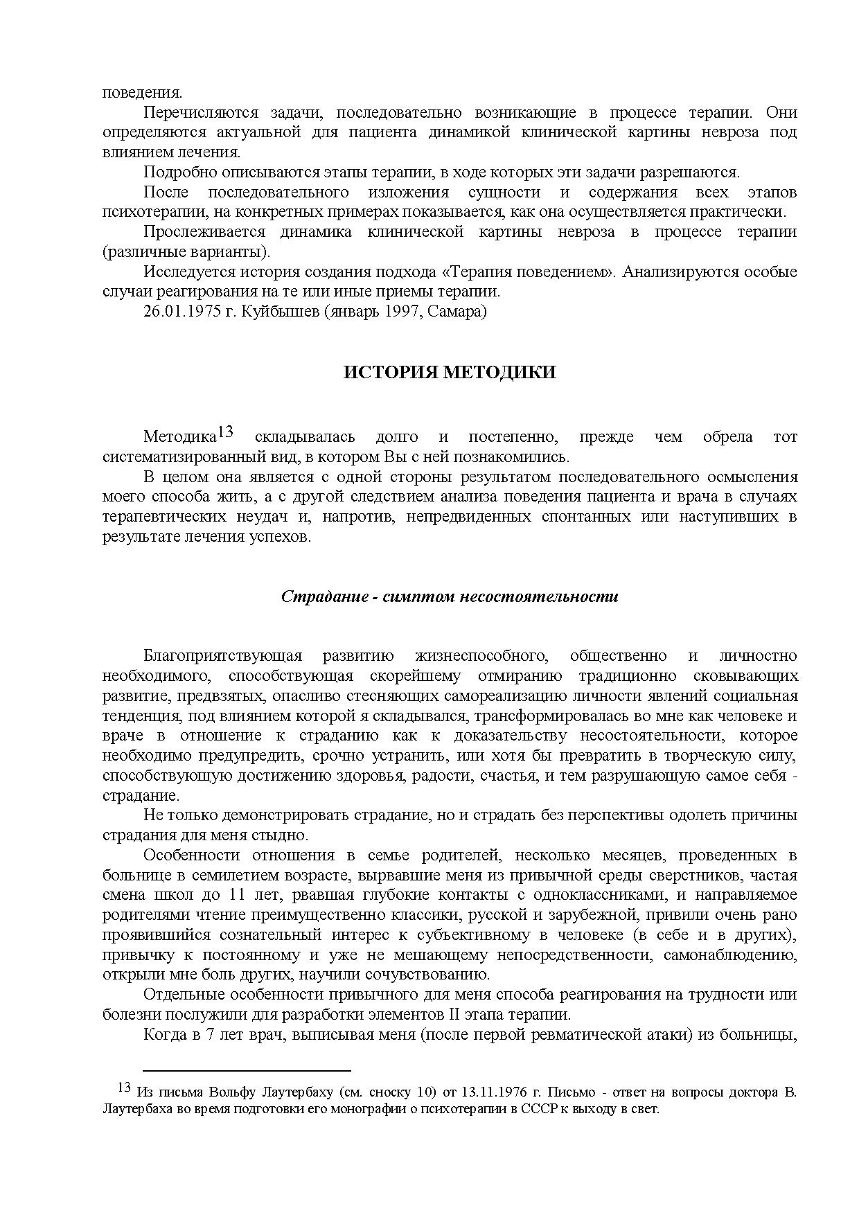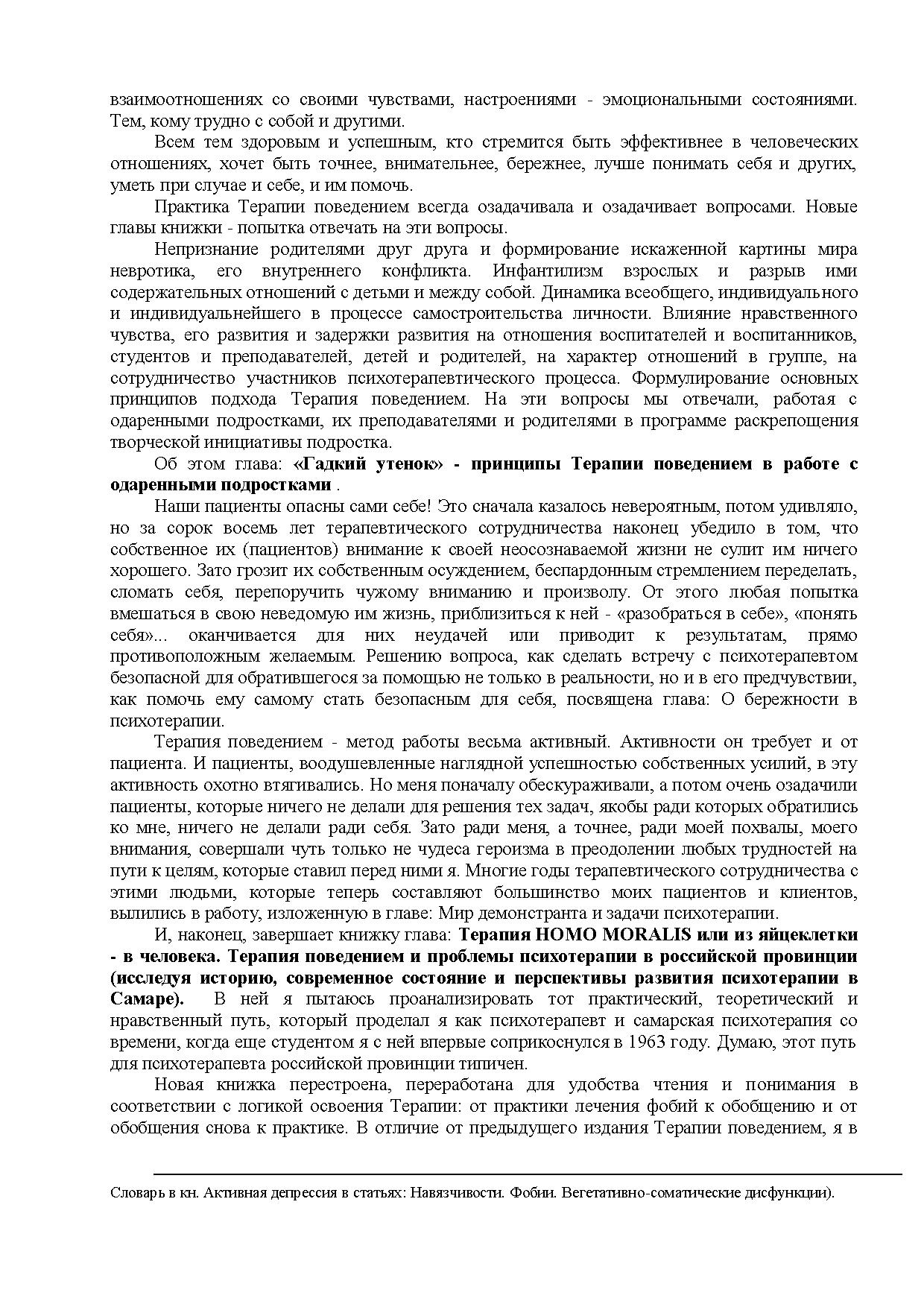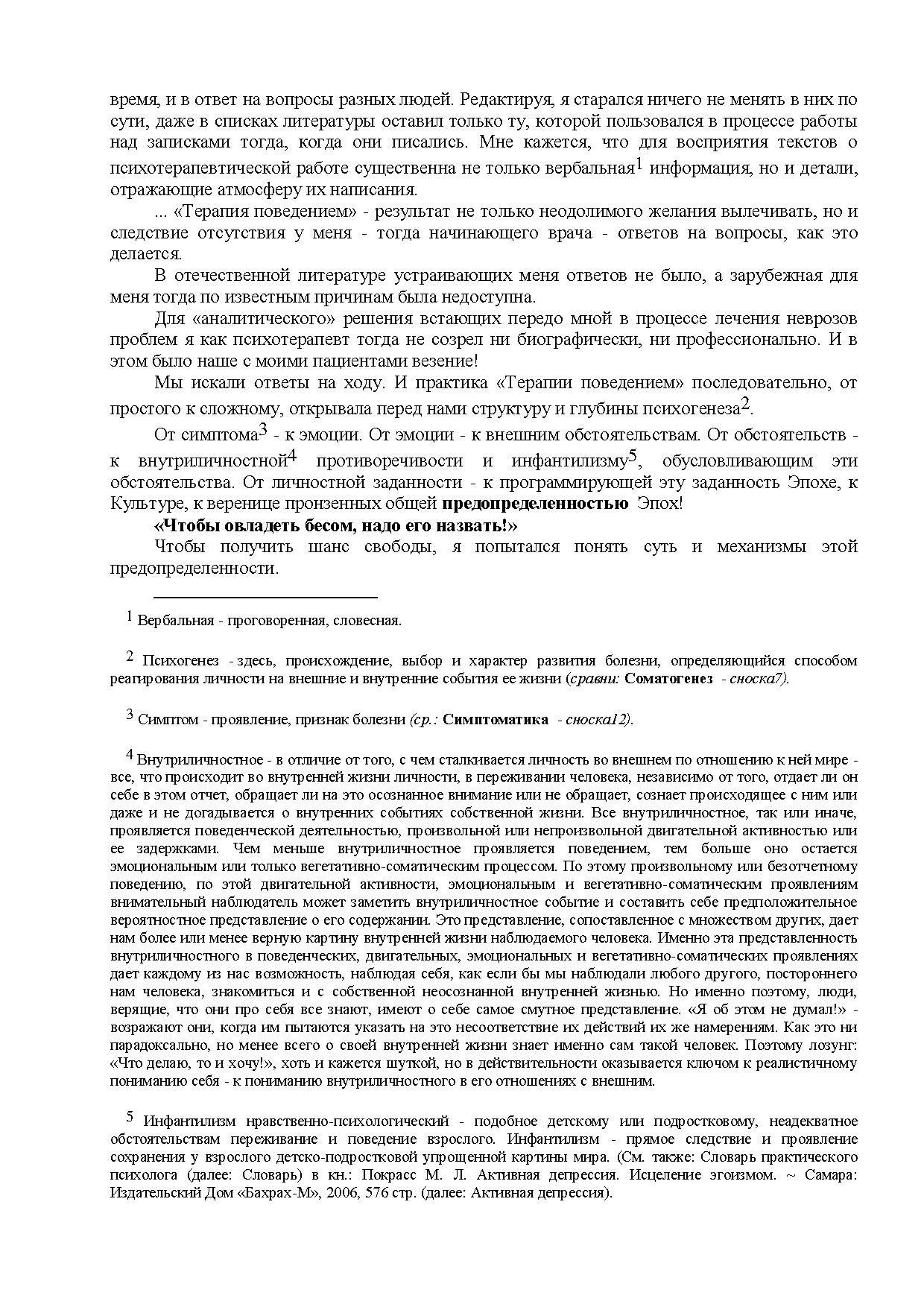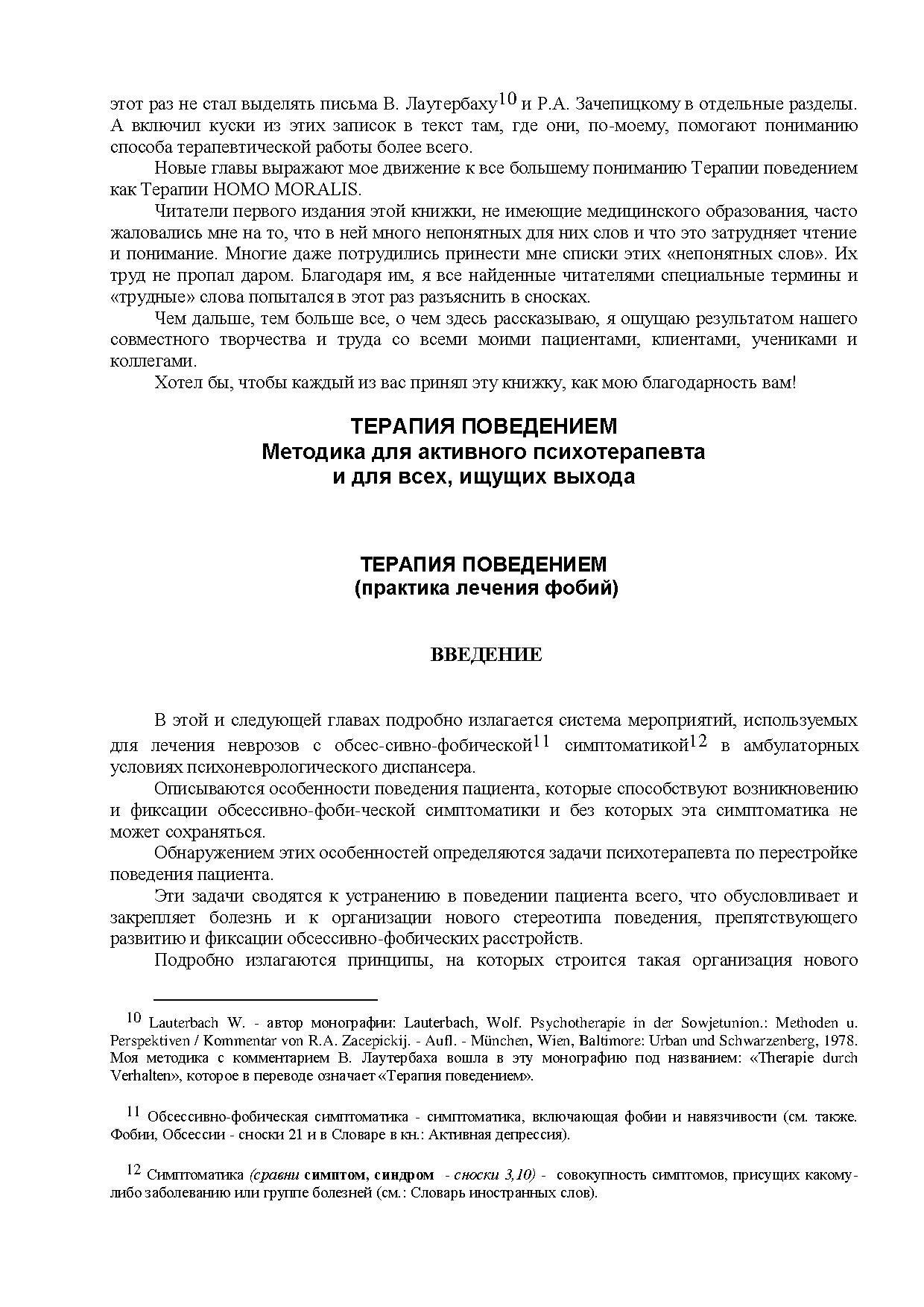 Новое издание «Терапии поведением» не просто «исправленное и дополненное», книга фактически написана заново, а ее объем вырос вдвое. Это последовательное изложение уникального авторского метода терапии расстройств личности и поведения. Адресованная специалистам (врачам, психотерапевтам, психологам, социальным работникам), книга содержит как теоретические основы психогенеза неврозов, психосоматических нарушений и личностных конфликтов, так и непосредственный опыт работы врача-психотерапевта и психиатра с пациентами, опыт исцеления, основанный на пристальном внимании автора « к субъективному в себе и в других».
