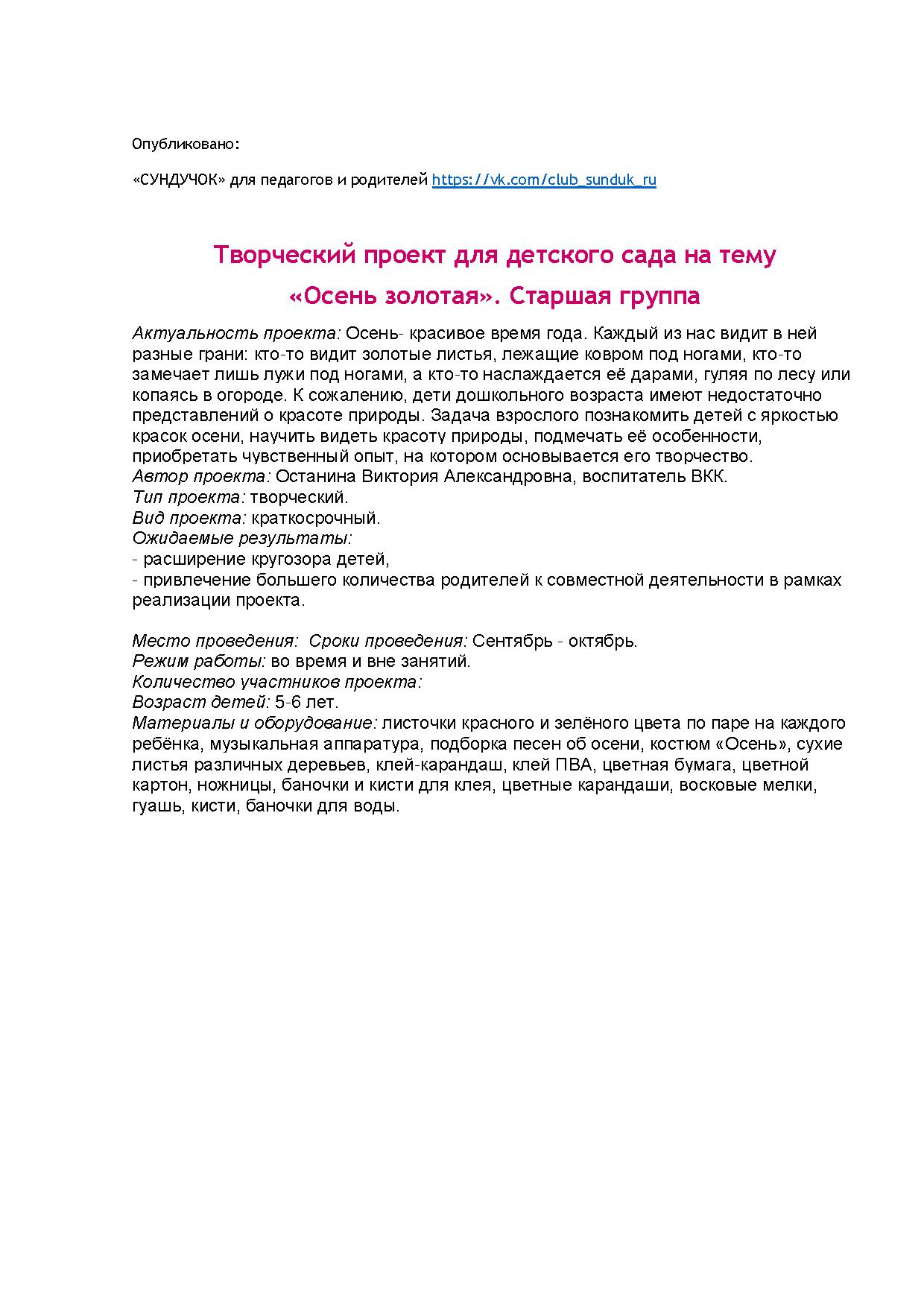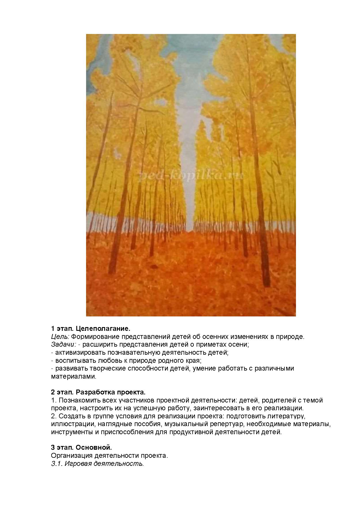 Актуальность проекта: Осень- красивое время года. Каждый из нас видит в ней разные грани: кто-то видит золотые листья, лежащие ковром под ногами, кто-то замечает лишь лужи под ногами, а кто-то наслаждается её дарами, гуляя по лесу или копаясь в огороде. К сожалению, дети дошкольного возраста имеют недостаточно представлений о красоте природы. Задача взрослого познакомить детей с яркостью красок осени, научить видеть красоту природы, подмечать её особенности, приобретать чувственный опыт, на котором основывается его творчество.
