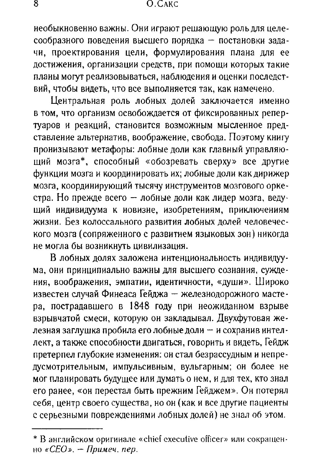 Однако сущность индивидуума, ядро личности, обычно остаётся не задетым. Все это меняется, если заболевание поражает лобные доли. То, что утрачивается в этом случае, уже не просто свойство вашей души. Это и есть ваша душа, ваша сущность, ваше Я. Лобные доли являются наиболее специфически человеческой из всех мозговых структур, и они играют решающую роль в успехе или неудаче человеческих начинаний.