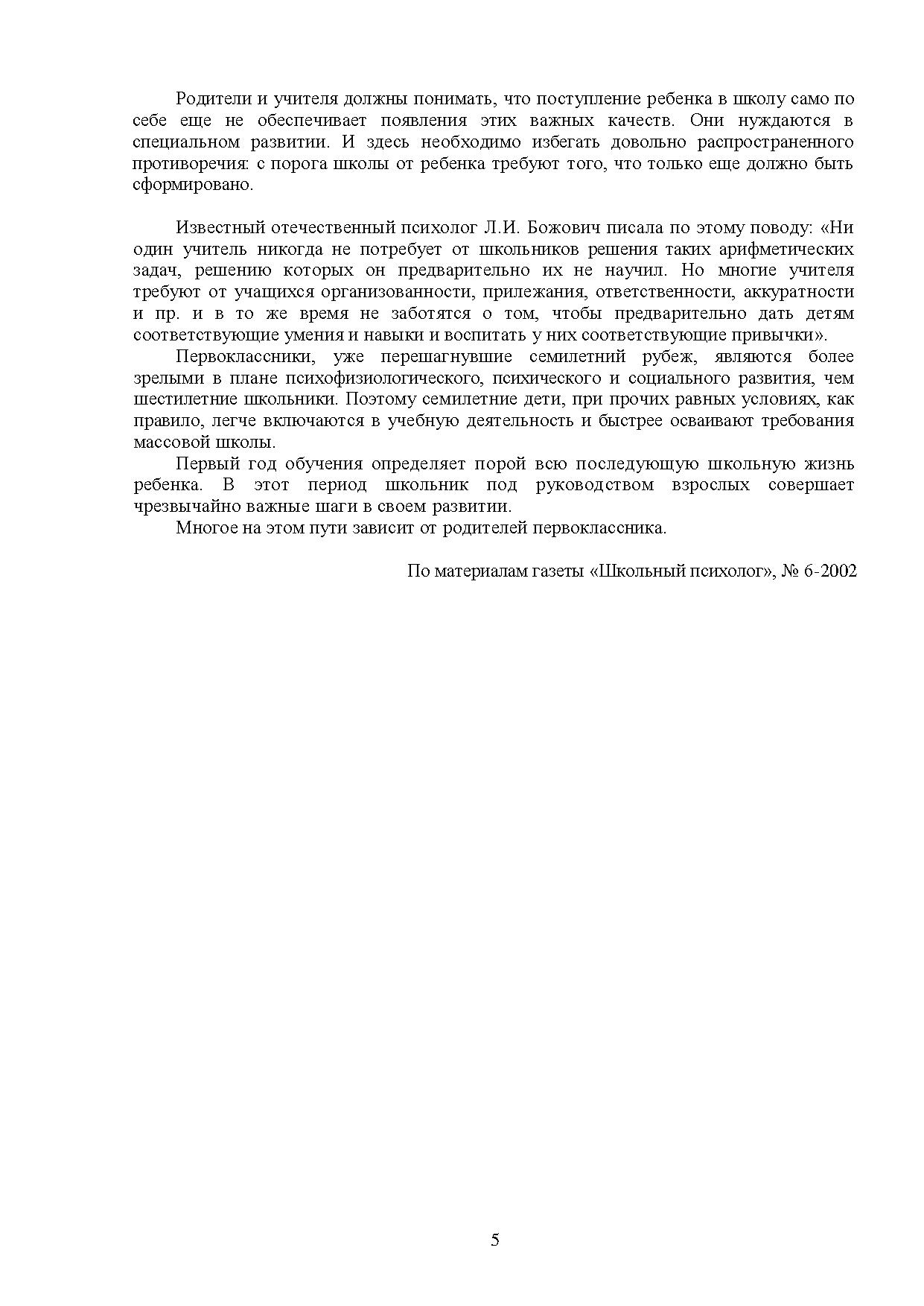 В поддержании у первоклассника «внутренней позиции школьника» неоценимая роль принадлежит родителям. Их серьезное отношение к школьной жизни ребенка, внимание к его успехам и неудачам, терпение, обязательное поощрение стараний и усилий, эмоциональная поддержка помогают первокласснику почувствовать значимость своей деятельности, способствуют повышению самооценки ребенка, его уверенности в себе.