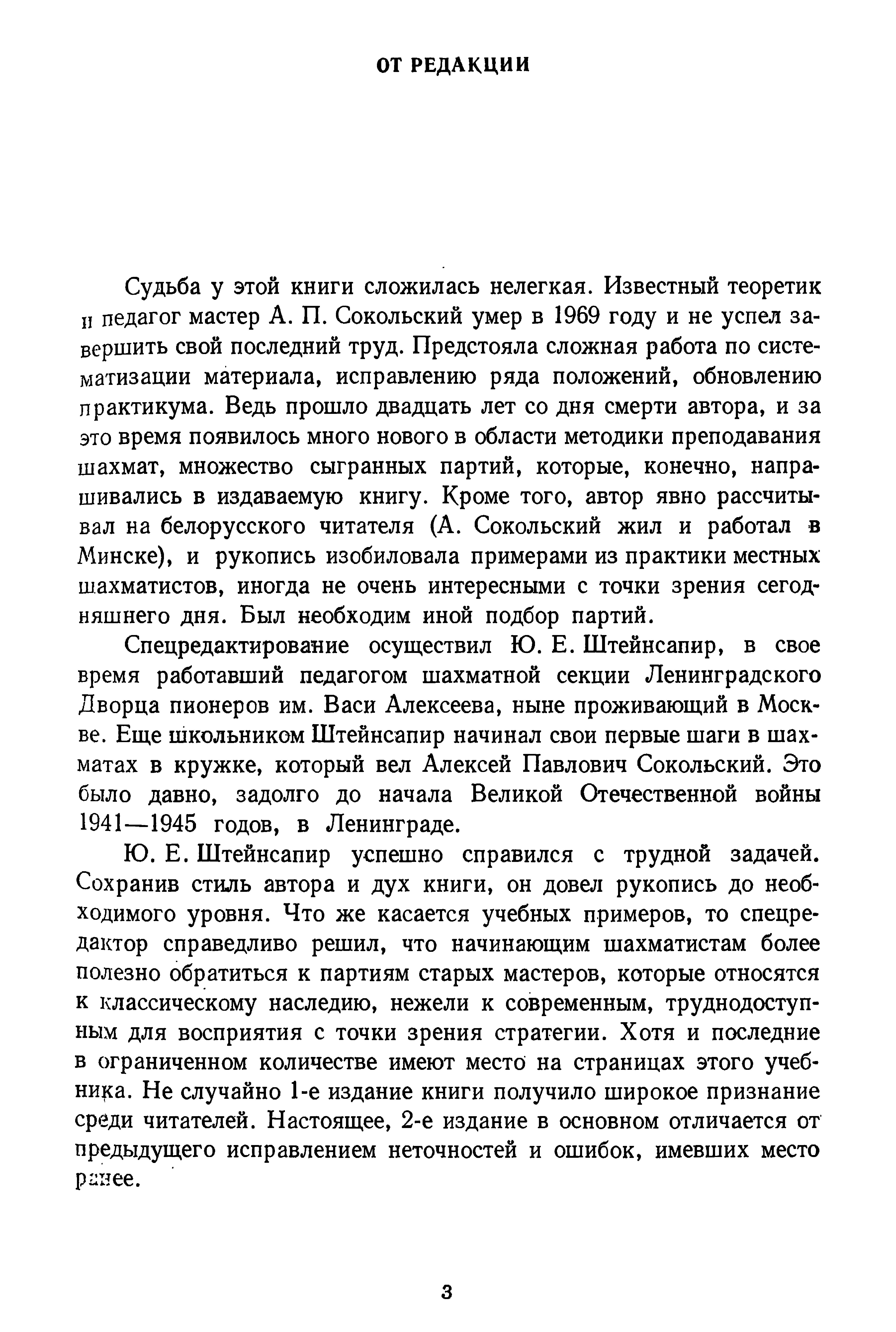Этот учебник шахматной игры для начинающих - незавершенный труд известного шахматного мастера и педагога А. П. Сокольского. Доработку и спецредактирование книги осуществил шахматный педагог кандидат в мастера Ю. Е. Штейнсапир.