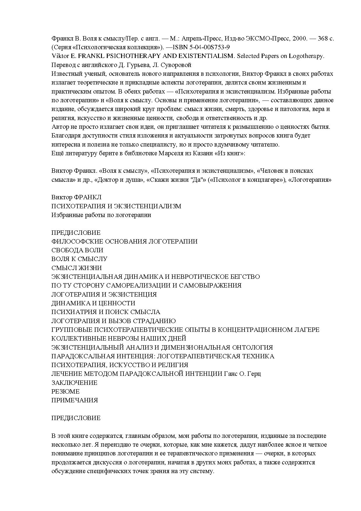 Известный ученый, основатель нового направления в психологии, Виктор Франкл в своих работах излагает теоретические и прикладные аспекты логотерапии, делится своим жизненным и практическим опытом. В обеих работах — «Психотерапия и экзистенциализм. Избранные работы по логотерапии» и «Воля к смыслу. Основы и применение логотерапии», — составляющих данное издание, обсуждается широкий круг проблем: смысл жизни, смерть, здоровье и патология, вера и религия, искусство и жизненные ценности, свобода и ответственность и др.
