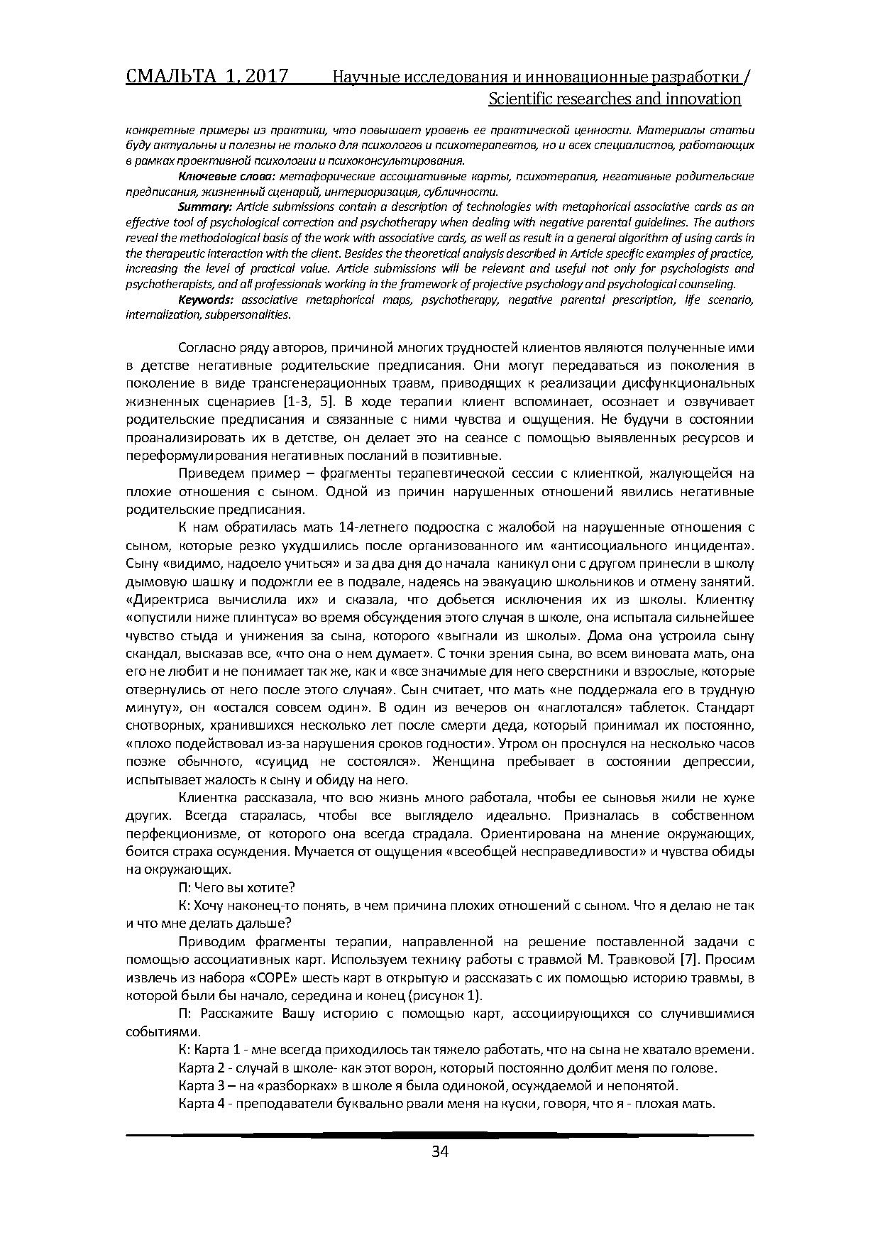 Материалы статьи содержат описание технологии работы с метафорическими ассоциативными картами как эффективным инструментом психологической коррекции и психотерапии при работе с негативными родительскими предписаниями.
