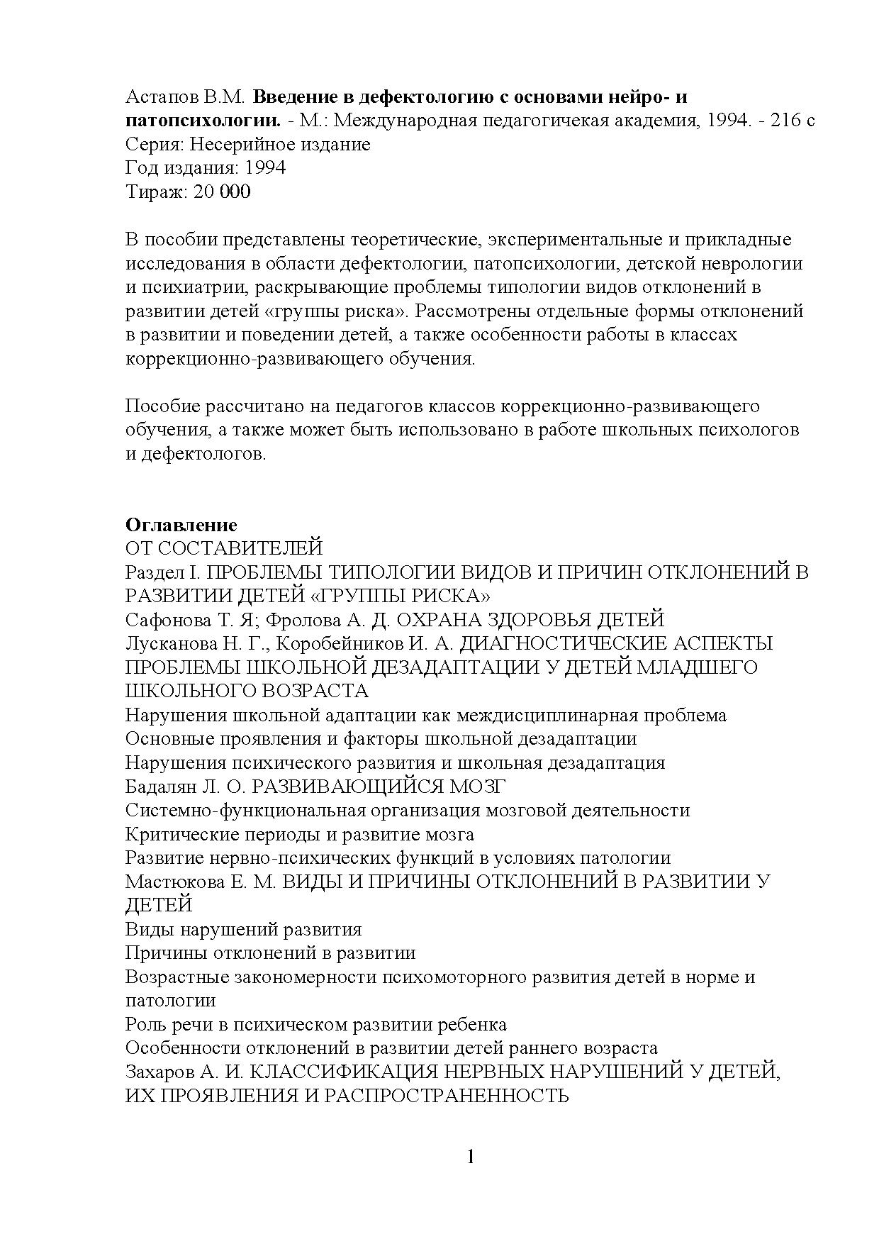 В пособии представлены теоретические, экспериментальные и прикладные исследования в области дефектологии, патопсихологии, детской неврологии и психиатрии, раскрывающие проблемы типологии видов отклонений в развитии детей «группы риска». Рассмотрены отдельные формы отклонений в развитии и поведении детей, а также особенности работы в классах коррекционно-развивающего обучения.