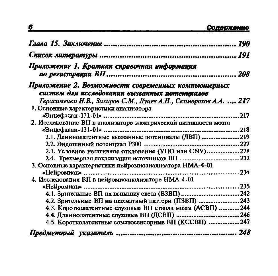 В книге в систематизированном виде изложена сущность метода выделения слабых ответов мозга, подробно описаны методики регистрации вызванных потенциалов (ВП), требования к аппаратуре для проведения ВП-исследований, рассмотрено влияние артефактов и погрешностей при выделении ВП. Большое внимание уделено особенностям выделения и идентификации компонентов ответа основных видов ВП: зрительных, слуховых, соматосенсорных и когнитивных. Приведены нормативные данные и оценка влияния различных факторов на параметры ВП.