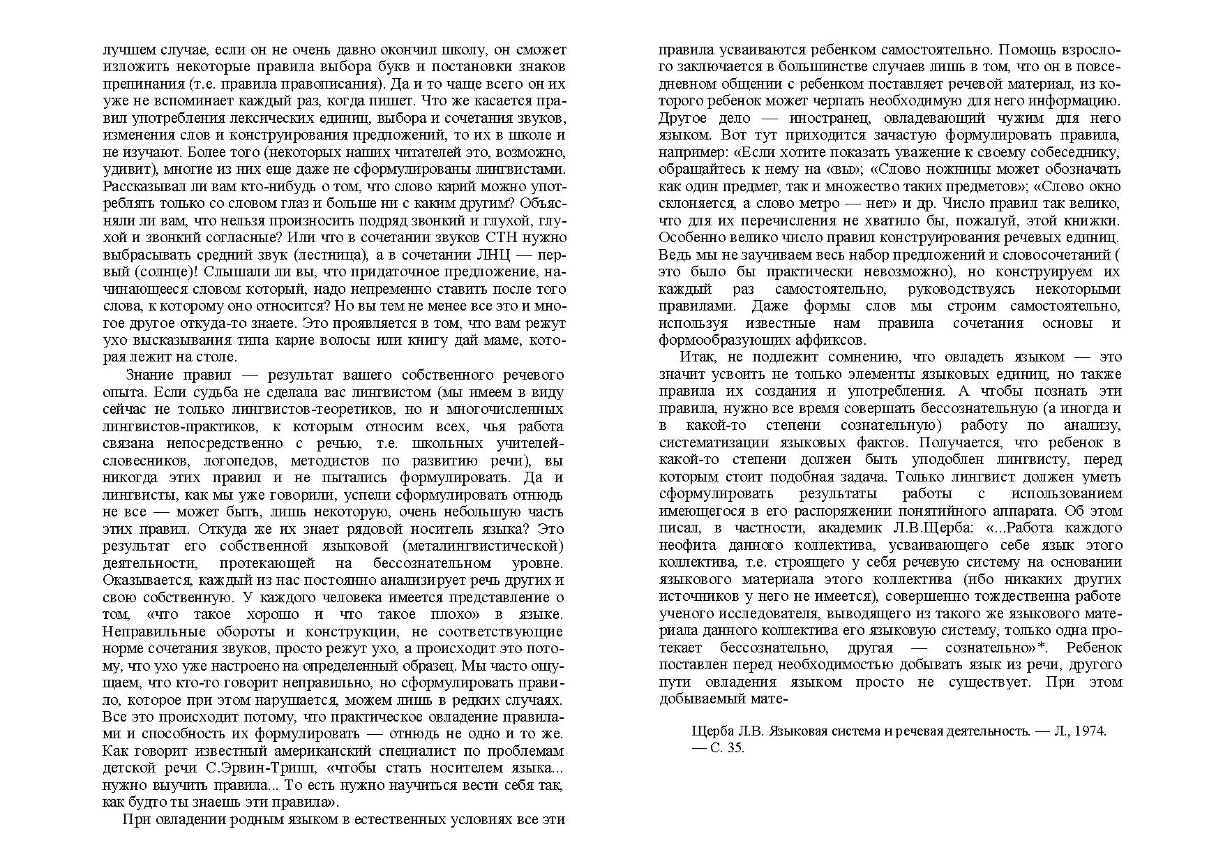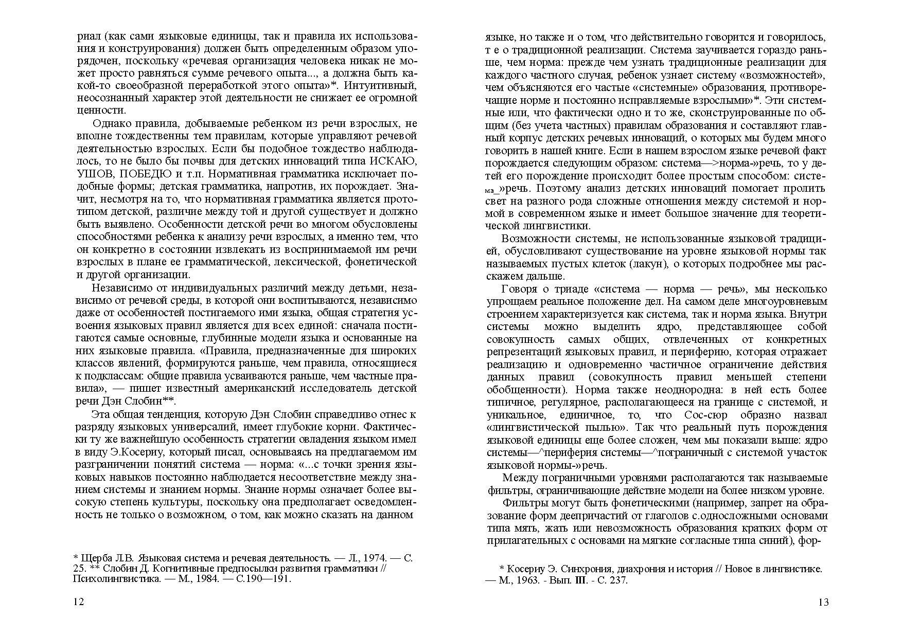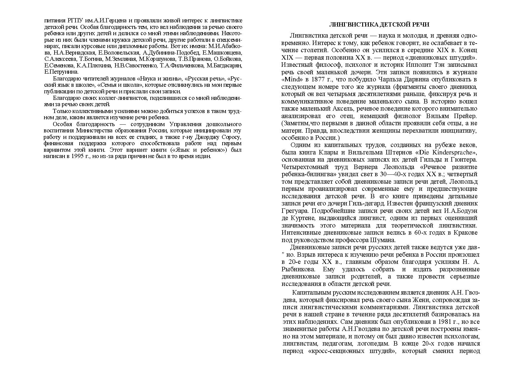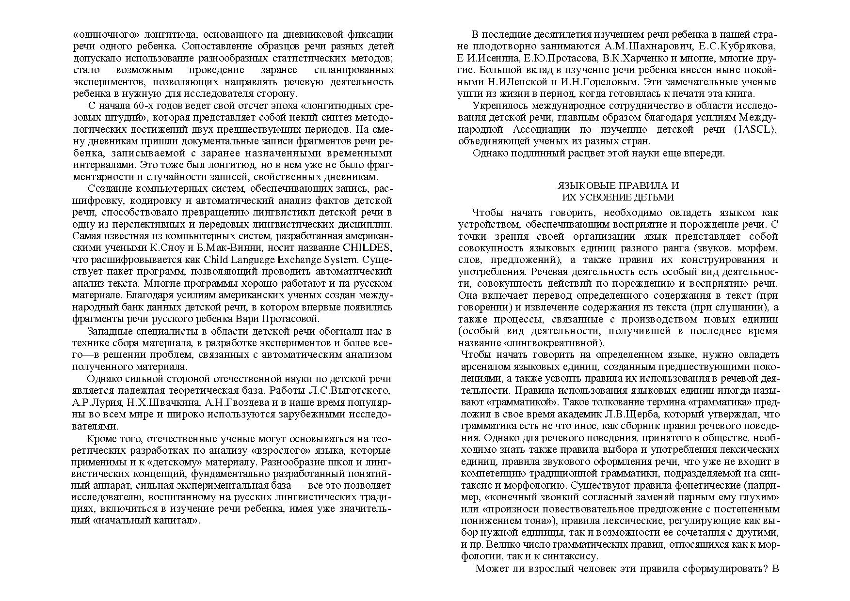 Автор придерживается «конструктивистского» подхода к проблеме освоения языка, т. е. полагает, что ребенок строит собственную языковую систему на основе речевых образцов, которые получает от взрослых. Поэтому большое место в пособии отводится проблеме качественного уровня речи взрослых (прежде всего, речи матери), а также закономерностям усвоения языковых норм и правил (от общих — к частным, от частных — к единичным исключениям).