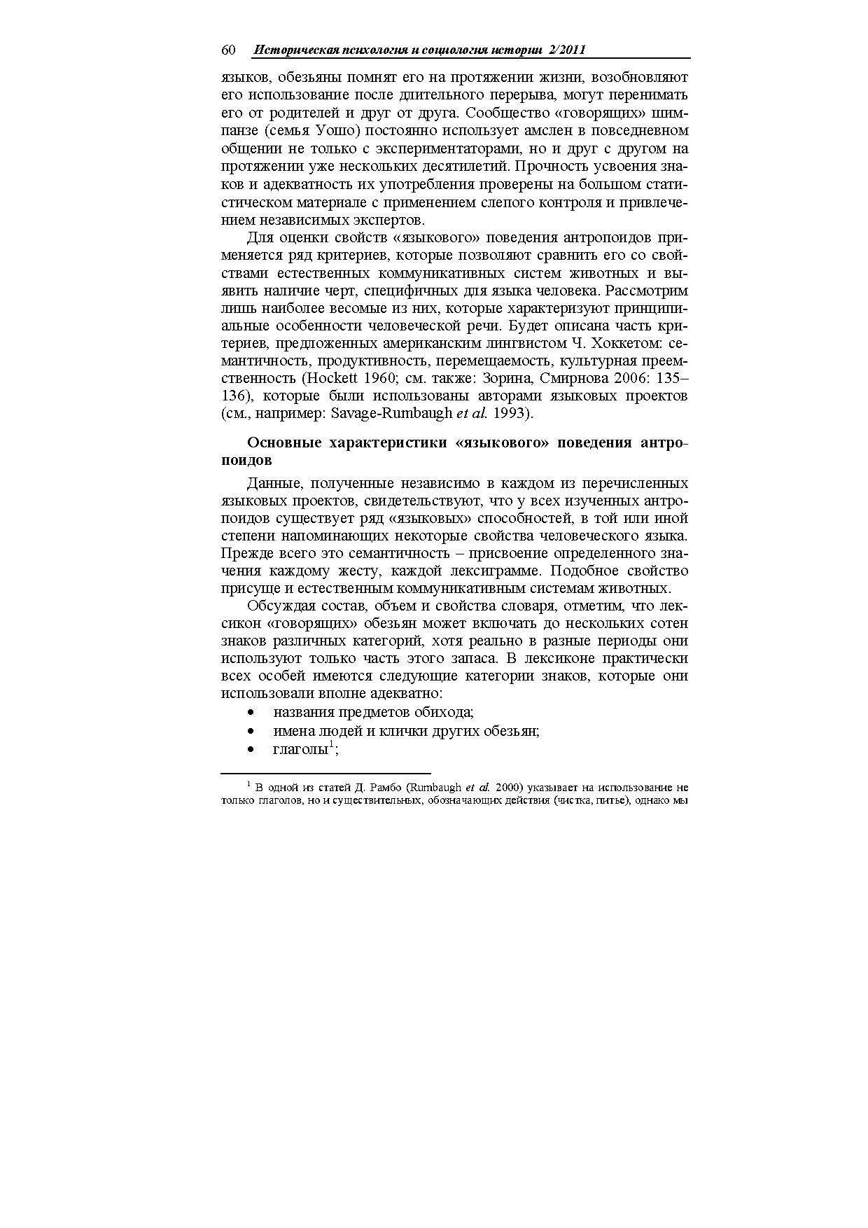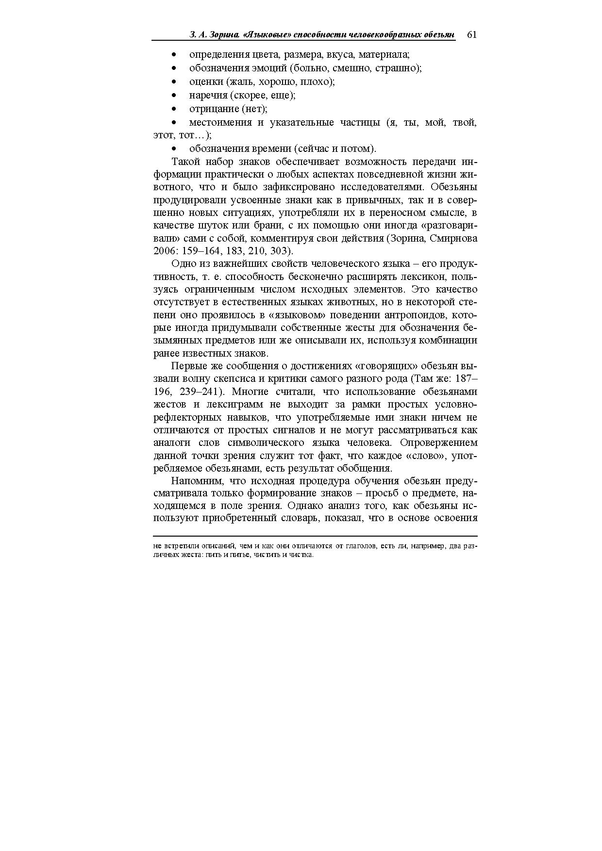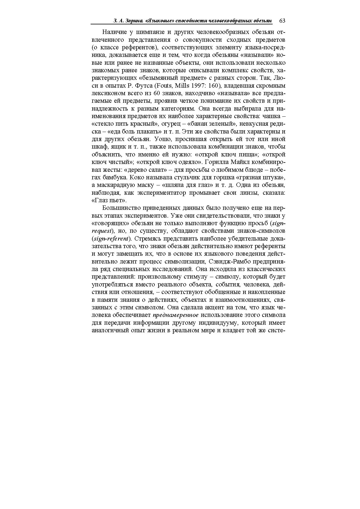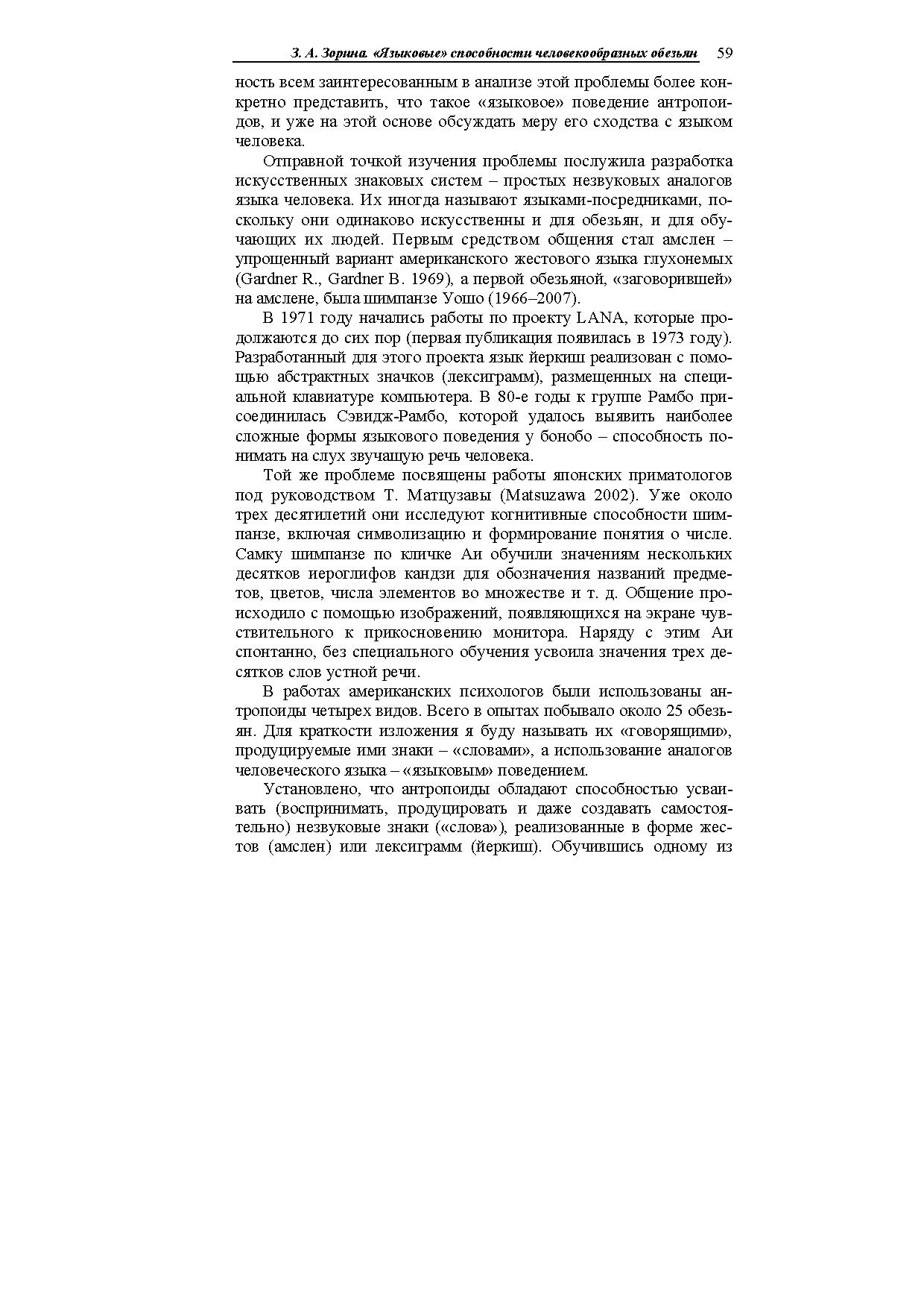 В статье описаны опыты американских психологов, обучавших антропоидов простым незвуковым аналогам человеческого языка (амслен, йеркиш). Показано, что они усваивают до нескольких сотен знаковреферентов, употребляют их в разных ситуациях, в том числе совершенно новых, адекватно пользуются местоимениями, понимают значение порядка слов в предложении, могут вести диалоги (в основном короткие), передавать информацию об отсутствующих предметах и (в очень ограниченной степени) о событиях прошлого и планах на будущее.