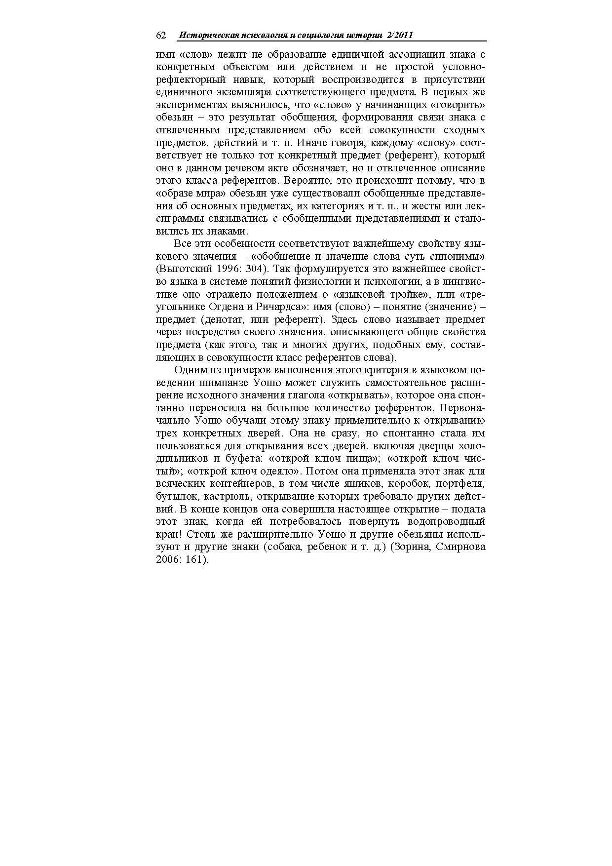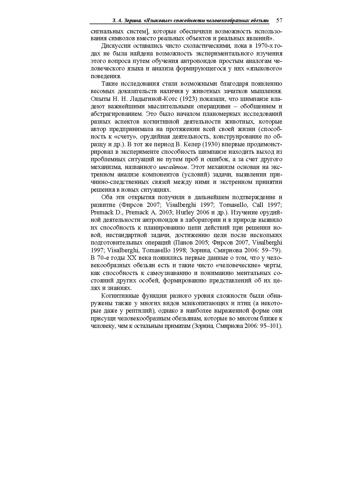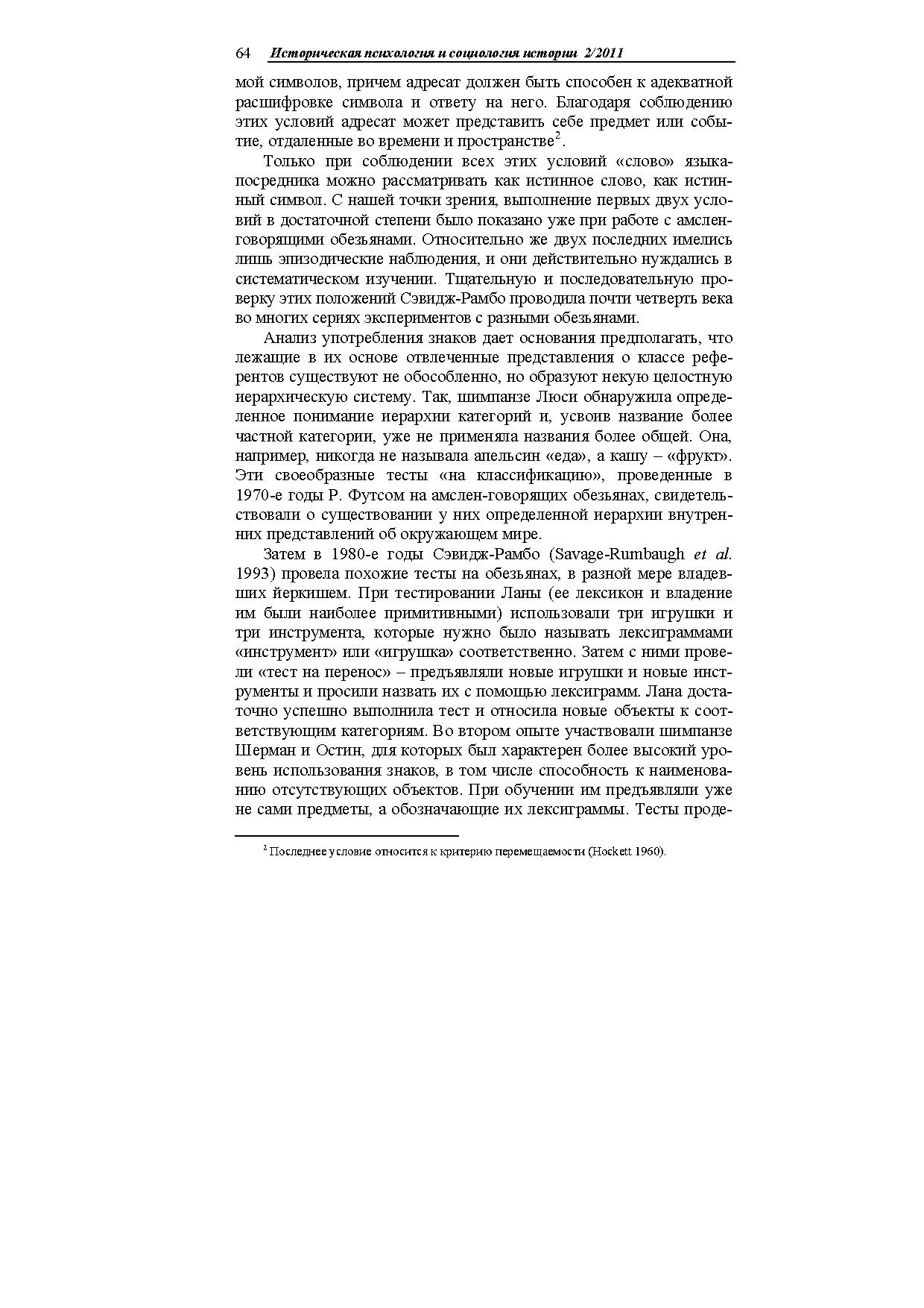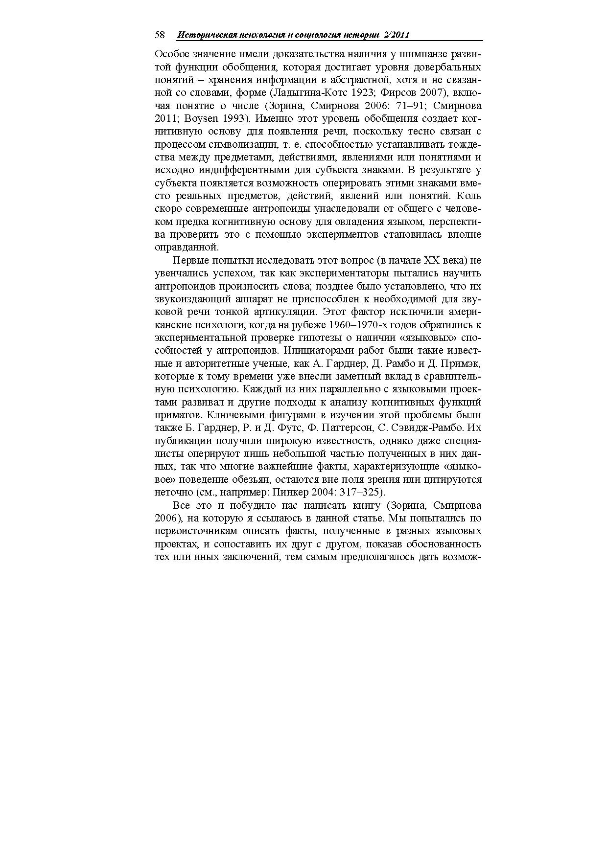 В статье описаны опыты американских психологов, обучавших антропоидов простым незвуковым аналогам человеческого языка (амслен, йеркиш). Показано, что они усваивают до нескольких сотен знаковреферентов, употребляют их в разных ситуациях, в том числе совершенно новых, адекватно пользуются местоимениями, понимают значение порядка слов в предложении, могут вести диалоги (в основном короткие), передавать информацию об отсутствующих предметах и (в очень ограниченной степени) о событиях прошлого и планах на будущее.