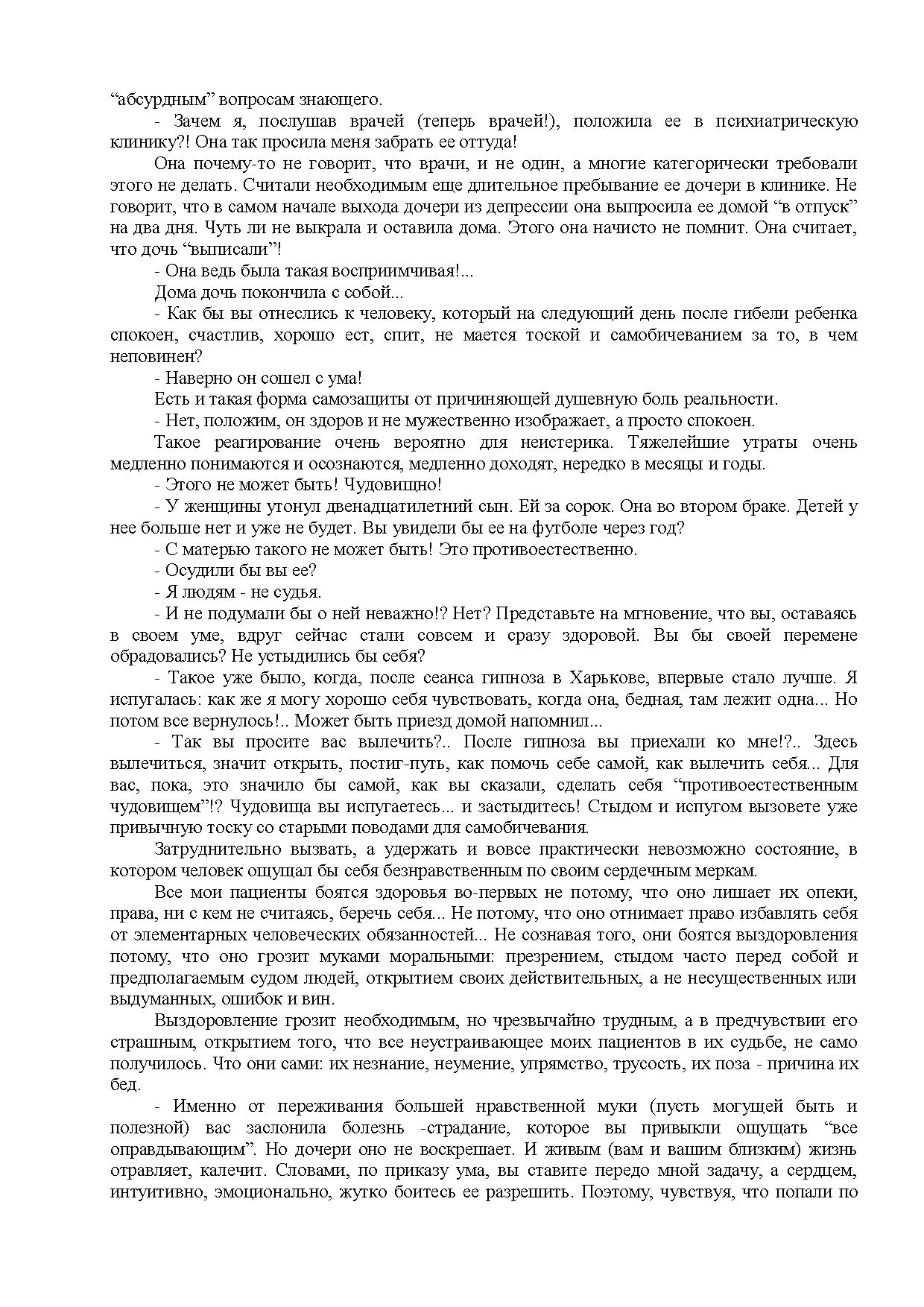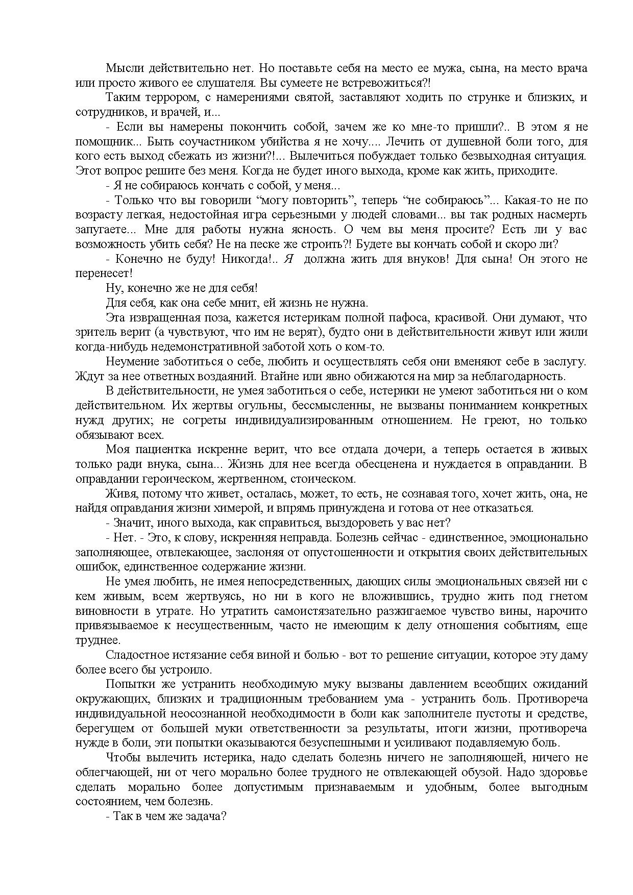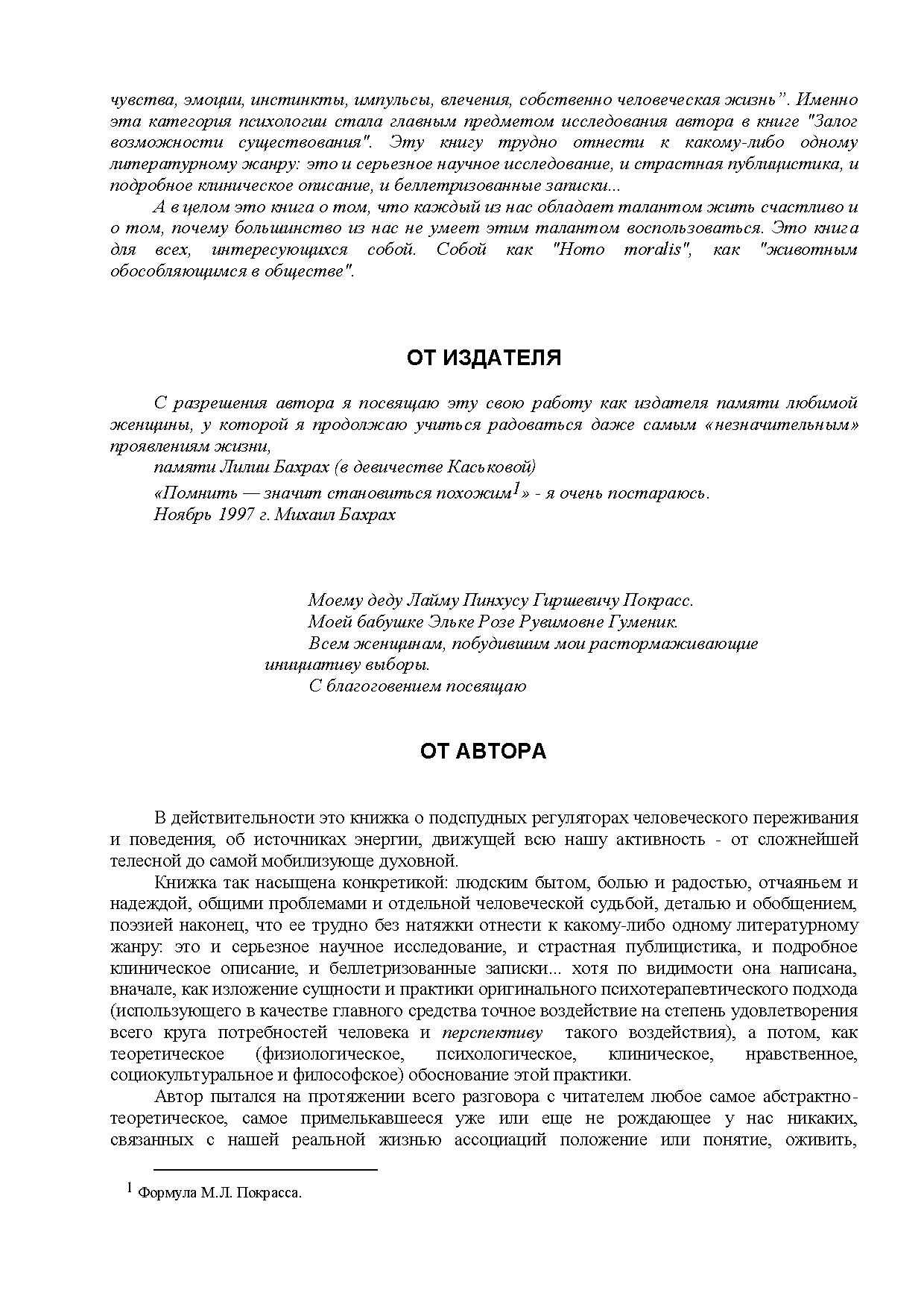 Михаил Львович Покрасс - известный врач-психотерапевт, основатель собственной психотерапевтической школы, автор книги "Терапия поведением”. В ней приводится определение пяти категорий психологии. Четвертая категория - "МОТИВ". "Она инструмент исследования "движущих пружин" человеческого существования, переживания и поведения. Здесь изучаются цели, программы поведения человека, его потребности, чувства, эмоции, инстинкты, импульсы, влечения, собственно человеческая жизнь”. Именно эта категория психологии стала главным предметом исследования автора в книге "Залог возможности существования". Эту книгу трудно отнести к какому-либо одному литературному жанру: это и серьезное научное исследование, и страстная публицистика, и подробное клиническое описание, и беллетризованные записки...