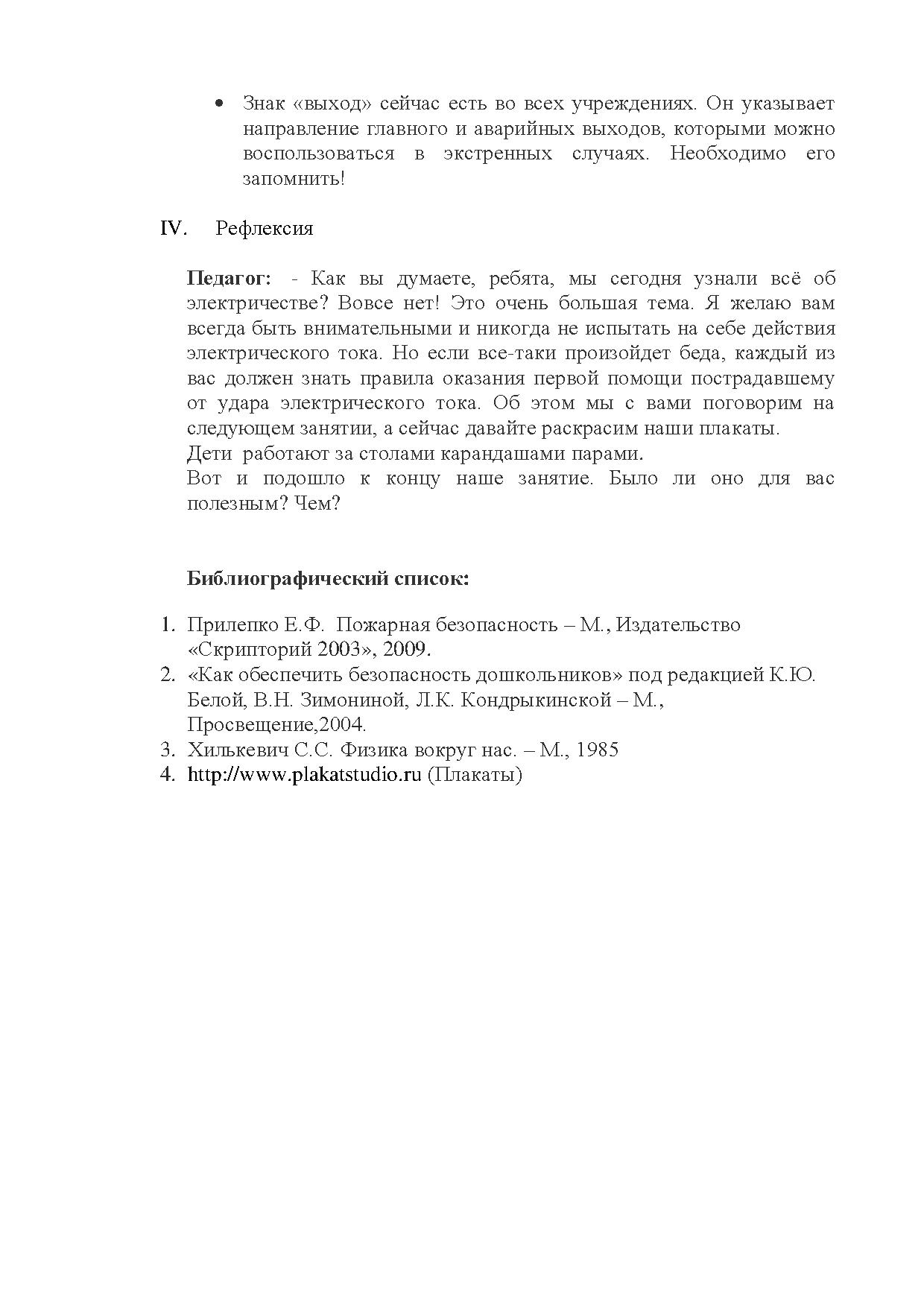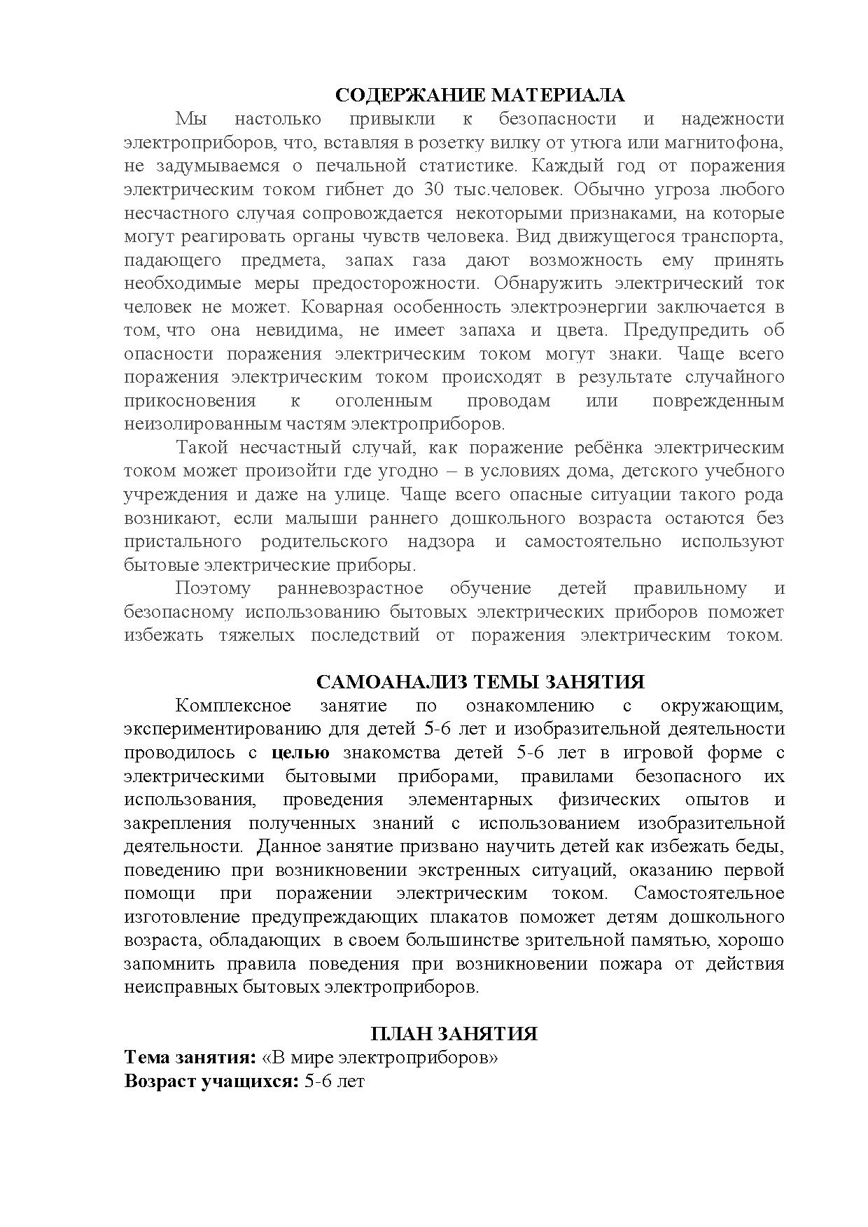 Данное занятие призвано научить детей как избежать беды, поведению при возникновении экстренных ситуаций, оказанию первой помощи при поражении электрическим током. Самостоятельное изготовление предупреждающих плакатов поможет детям дошкольного возраста, обладающих в своем большинстве зрительной памятью, хорошо запомнить правила поведения при возникновении пожара от действия неисправных бытовых электроприборов.