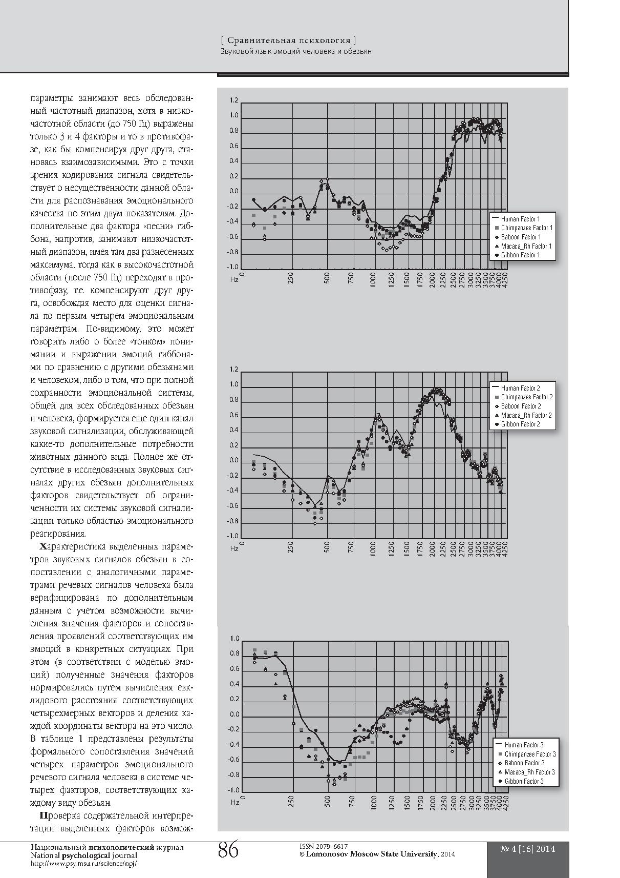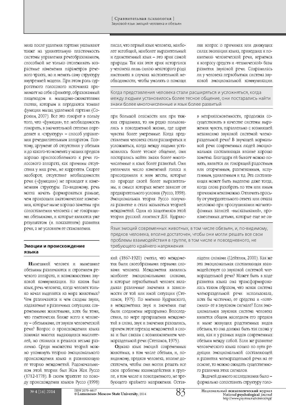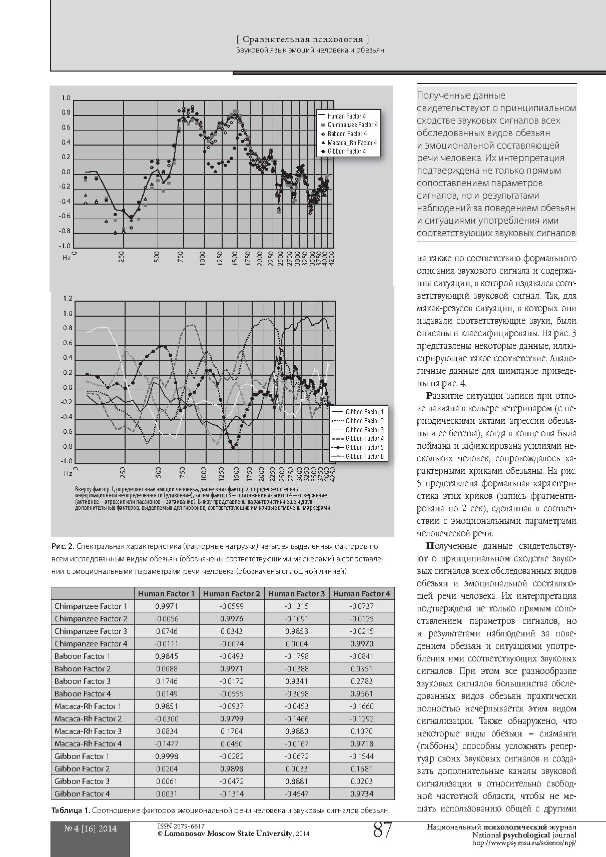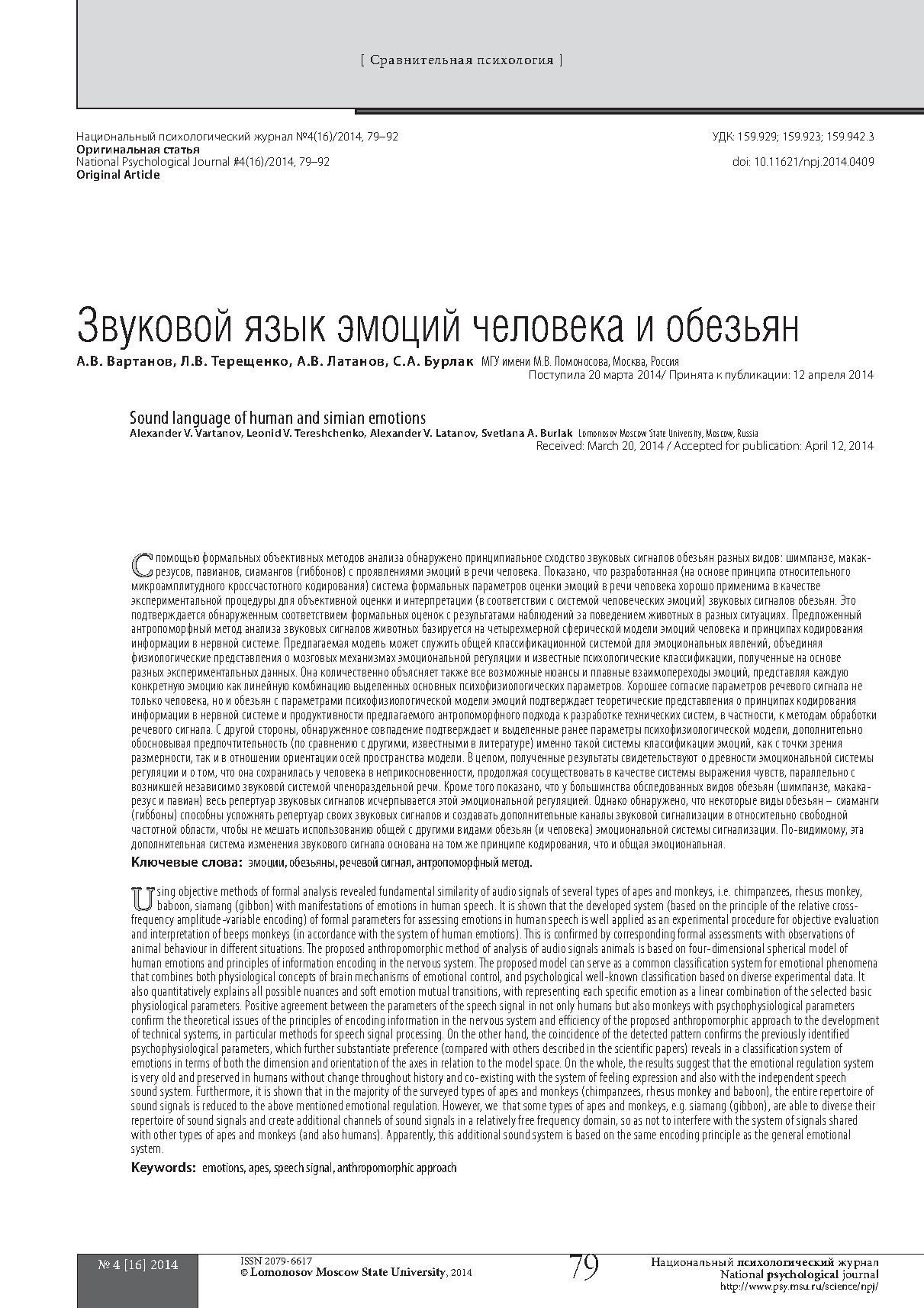 С помощью формальных объективных методов анализа обнаружено принципиальное сходство звуковых сигналов обезьян разных видов: шимпанзе, макакрезусов, павианов, сиамангов (гиббонов) с проявлениями эмоций в речи человека.