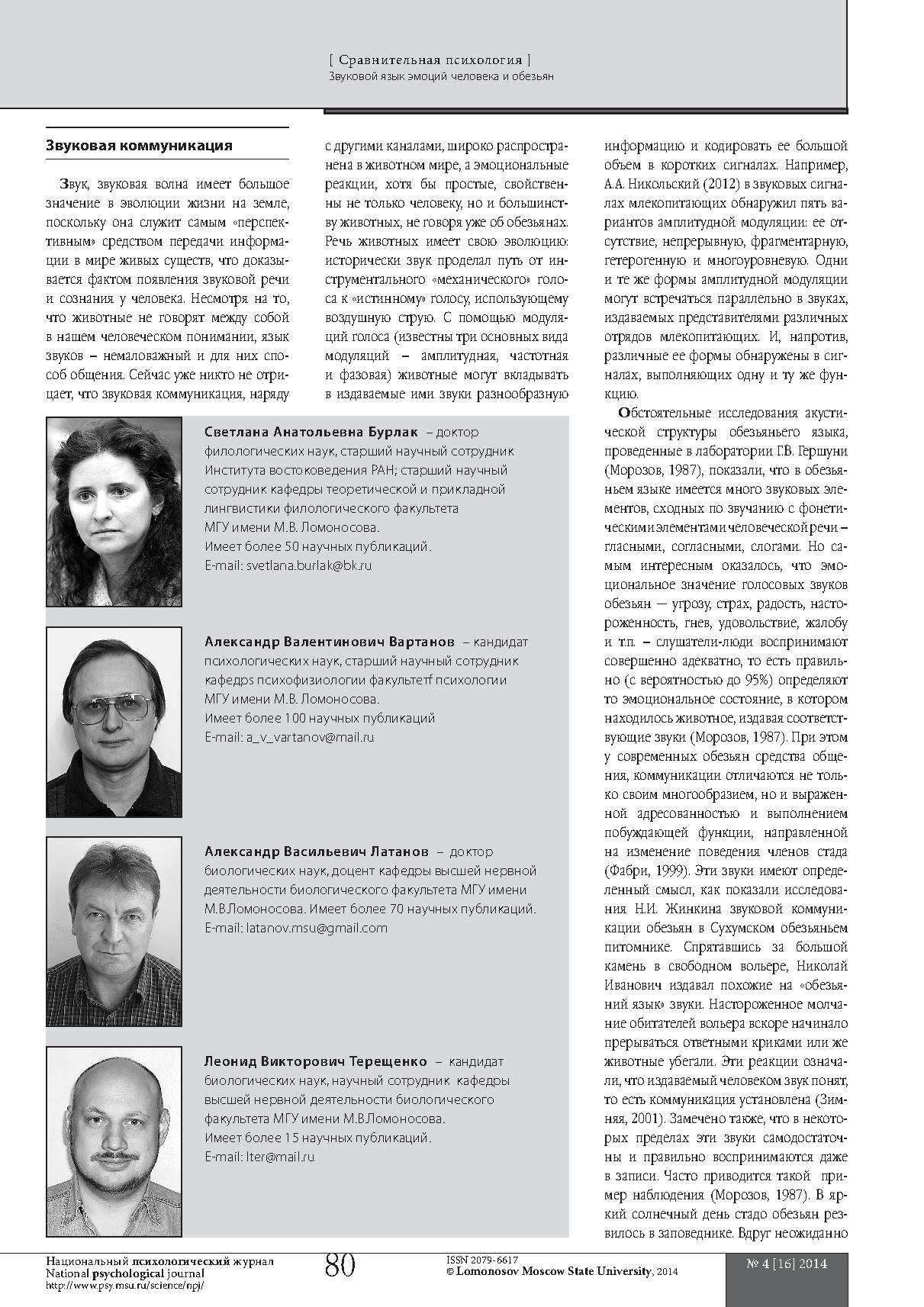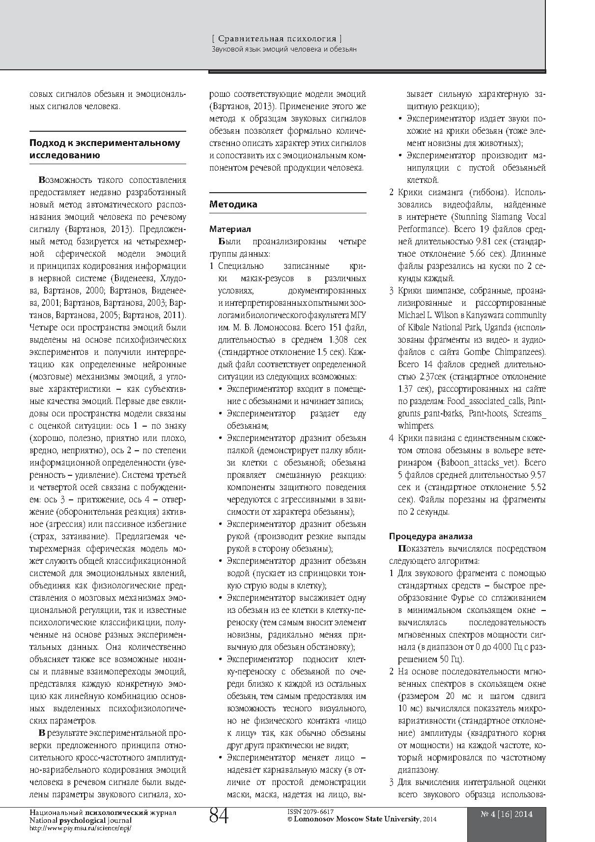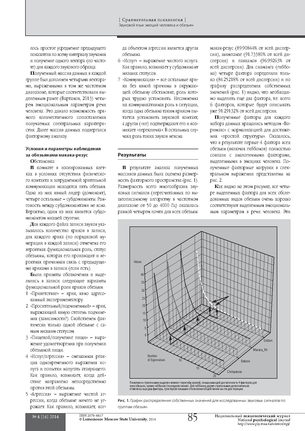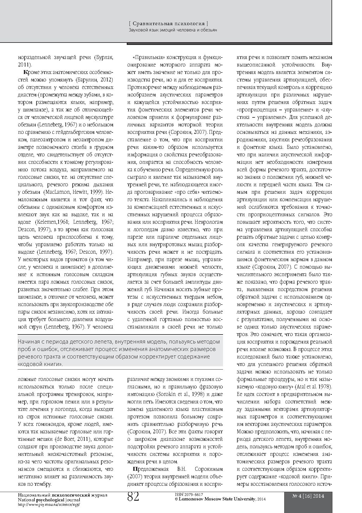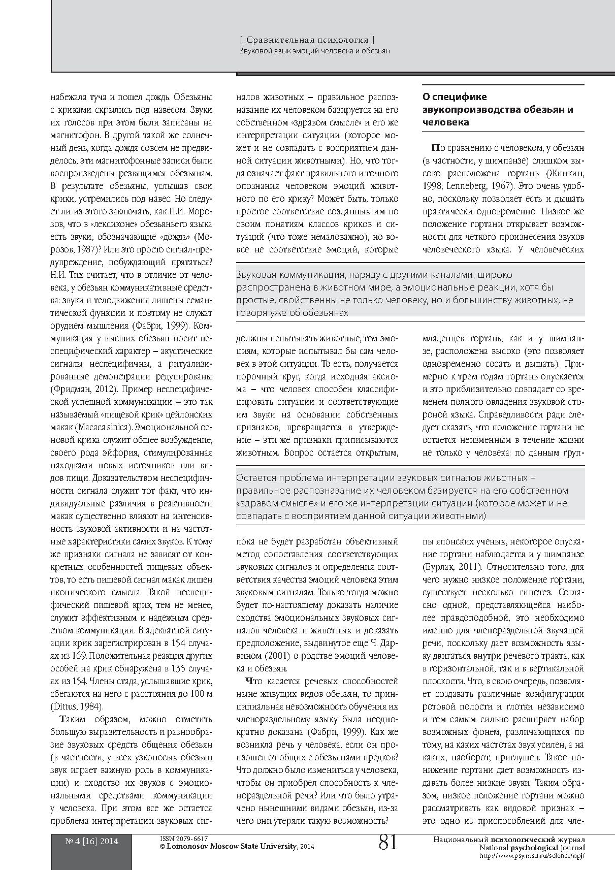 С помощью формальных объективных методов анализа обнаружено принципиальное сходство звуковых сигналов обезьян разных видов: шимпанзе, макакрезусов, павианов, сиамангов (гиббонов) с проявлениями эмоций в речи человека.
