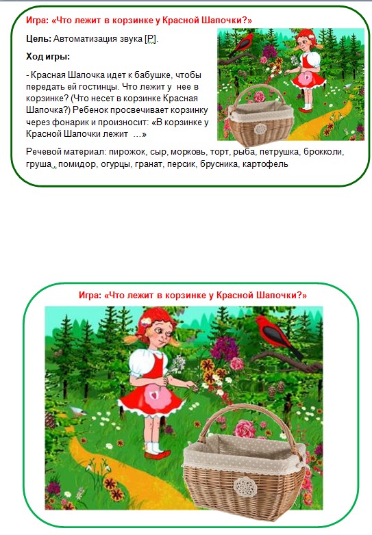 Ребёнку предлагается узнать, что лежит в корзинке у Красной Шапочки. Ребёнок кладет картинку с корзинкой на освещаемое окошко пособия (волшебной коробочки). И называет, что лежит в корзинке. На этапе автоматизации звука в слове, ребёнок отвечает одним словом.