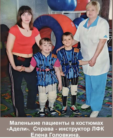 "Адели" – это специальная одежда для восстановления после болезней и травм. Она помогает детям с ДЦП, а также тем, кто перенес инсульт или ударился головой. Костюм очень удобен, потому что его можно подогнать под каждого человека. Он состоит из жилета, шорт, наколенников и обуви, которые соединены резинками. Эти резинки работают как мышцы: они помогают двигаться правильно и поддерживают тело. Есть специальные резинки, которые ставят стопу в нужное положение, разводят плечи и помогают делать другие важные движения.