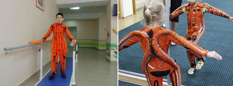 Реабилитационный комбинезон «Атлант» - этот костюм, который плотно прилегает к телу, имеет специальные воздушные подушки. Они расположены там, где находятся мышцы, которые работают друг против друга в туловище и конечностях.